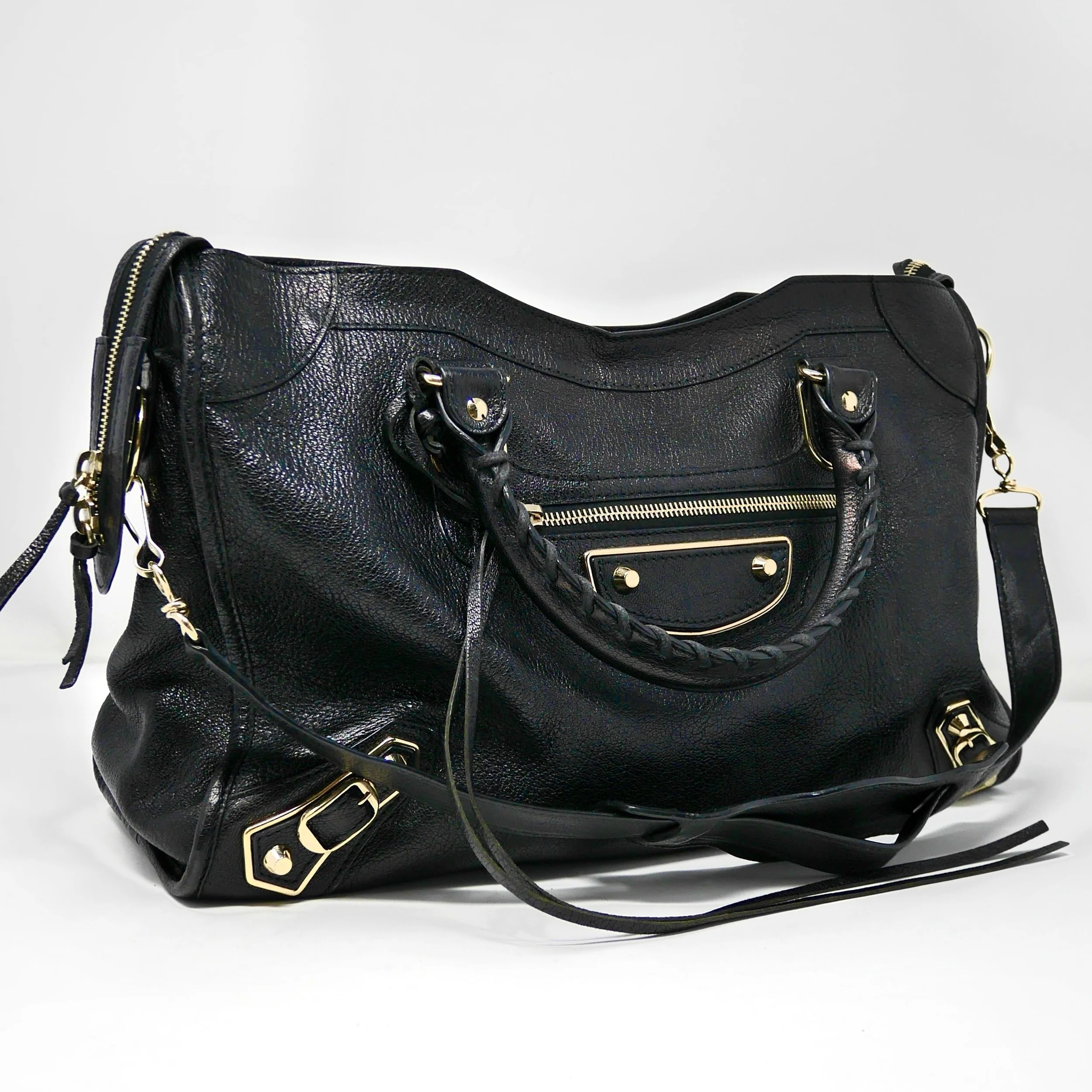 Crafted from luxurious black leather and adorned with gold-tone hardware, including the iconic studs and metallic edges, the Balenciaga City Classic Metallic Edge Bag exudes effortless style and sophistication. The whipstitch trim and single exterior pocket add a touch of contemporary flair to its classic design.