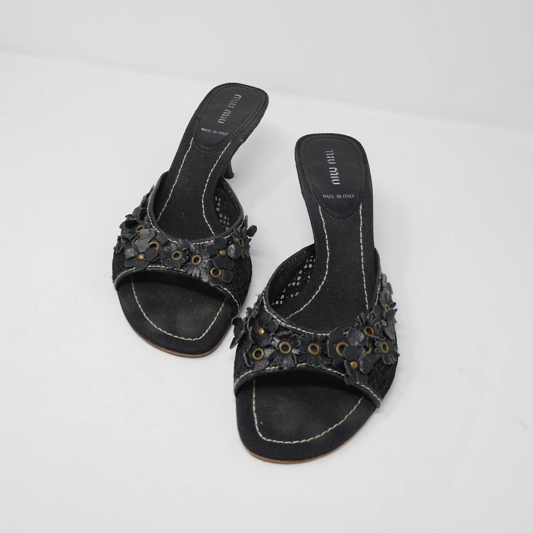 Miu Miu sandals feature a black lace upper adorned with floral appliqué and grommet detailing. The slip-on silhouette is set on a modest kitten heel. Finished with contrast stitching and a square toe.