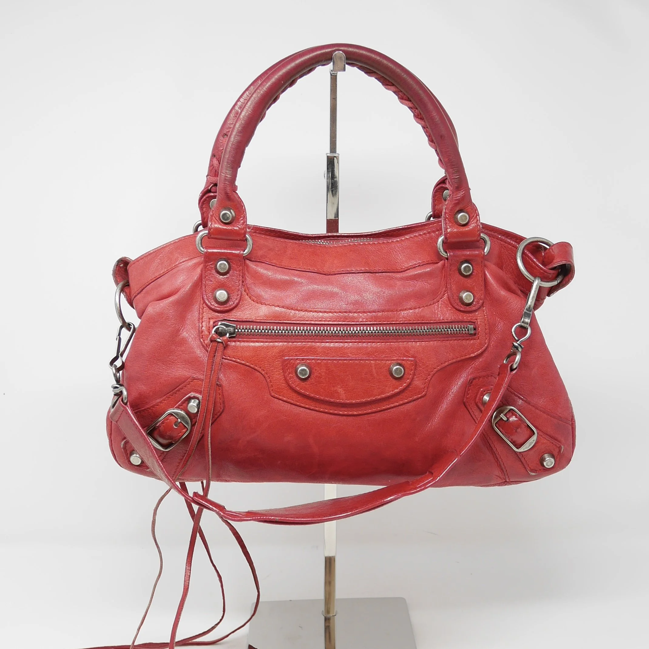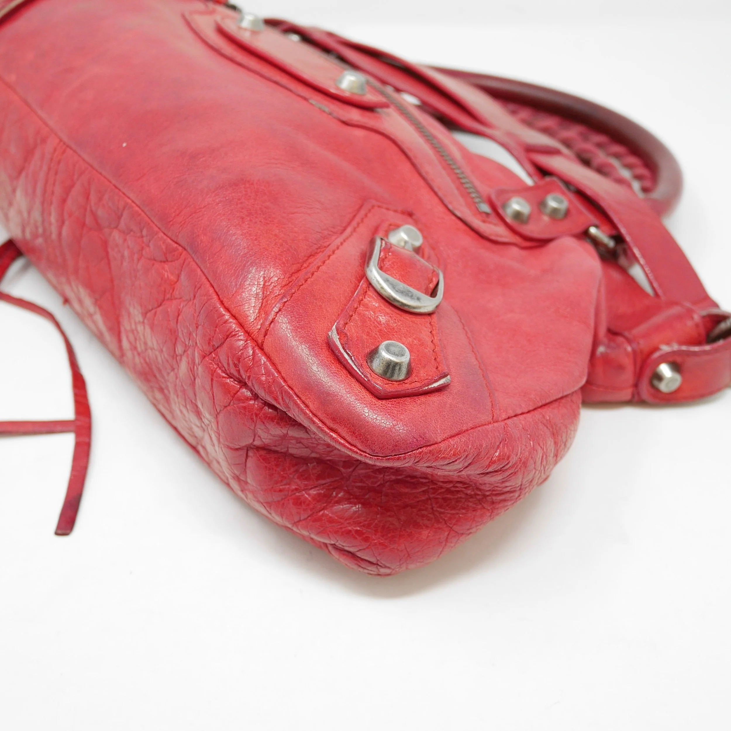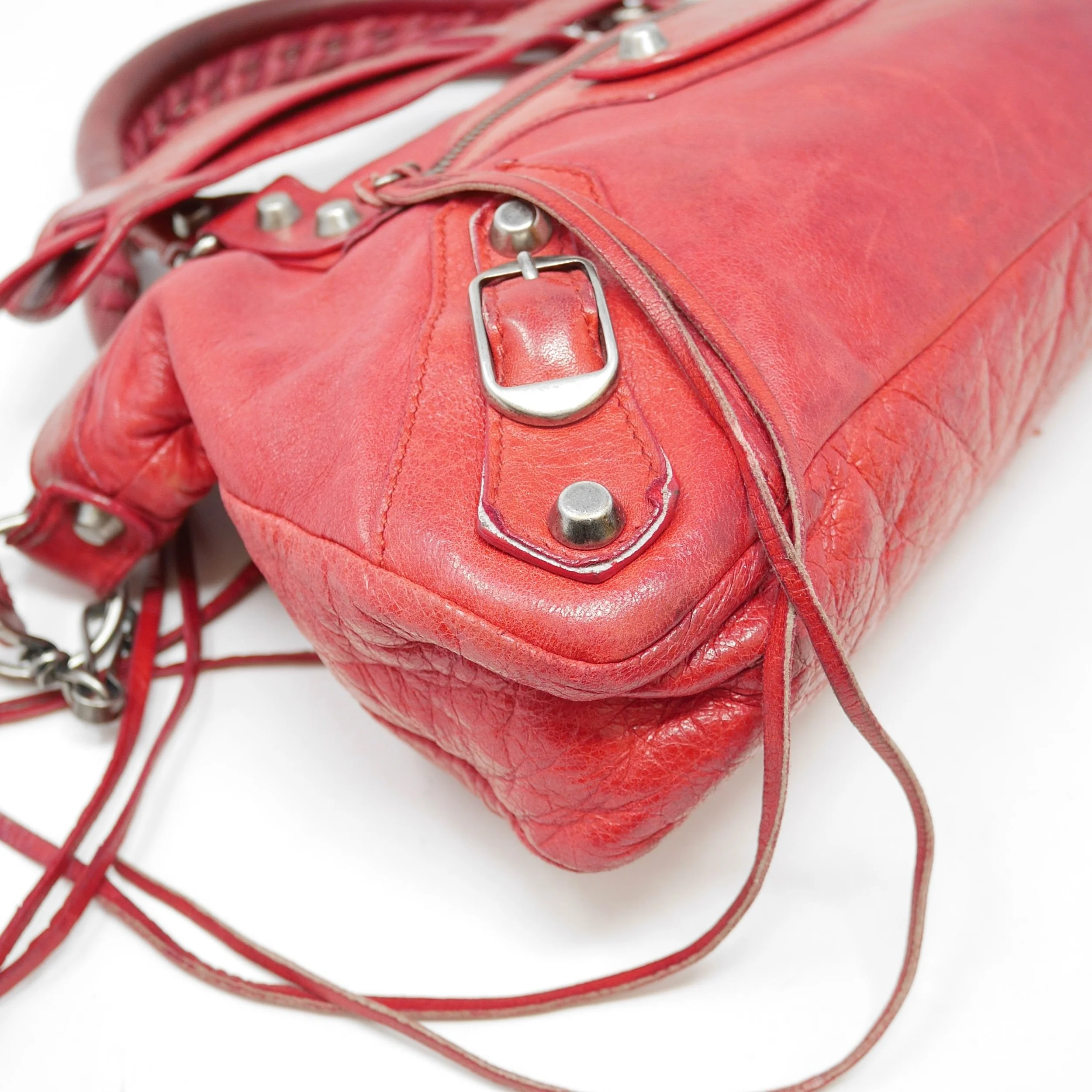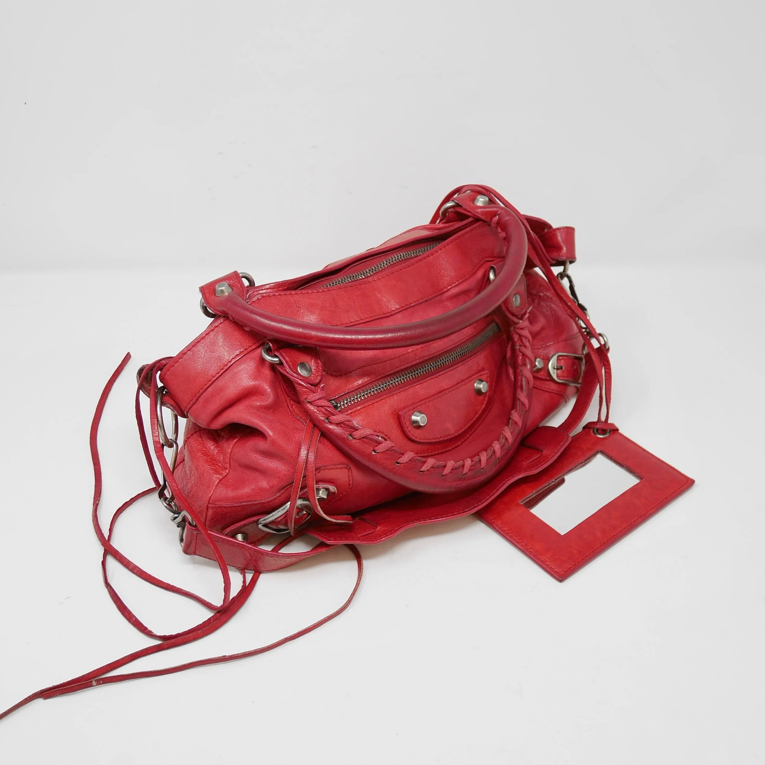 Statement Balenciaga City bag in vibrant red distressed lambskin leather. Features signature motorcycle-inspired details with stud accents, front zip pocket, braided top handles, and a detachable shoulder strap. Includes matching leather-framed mirror.