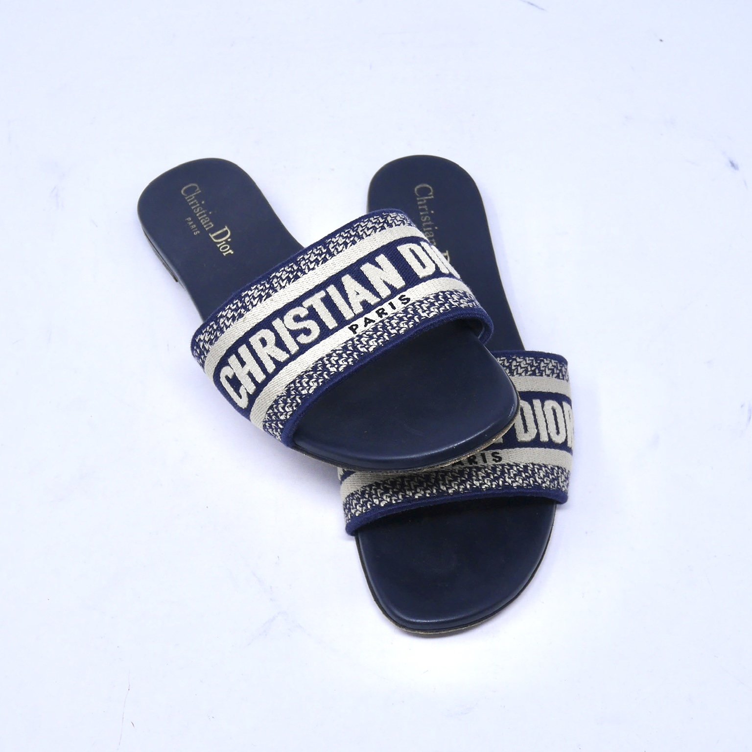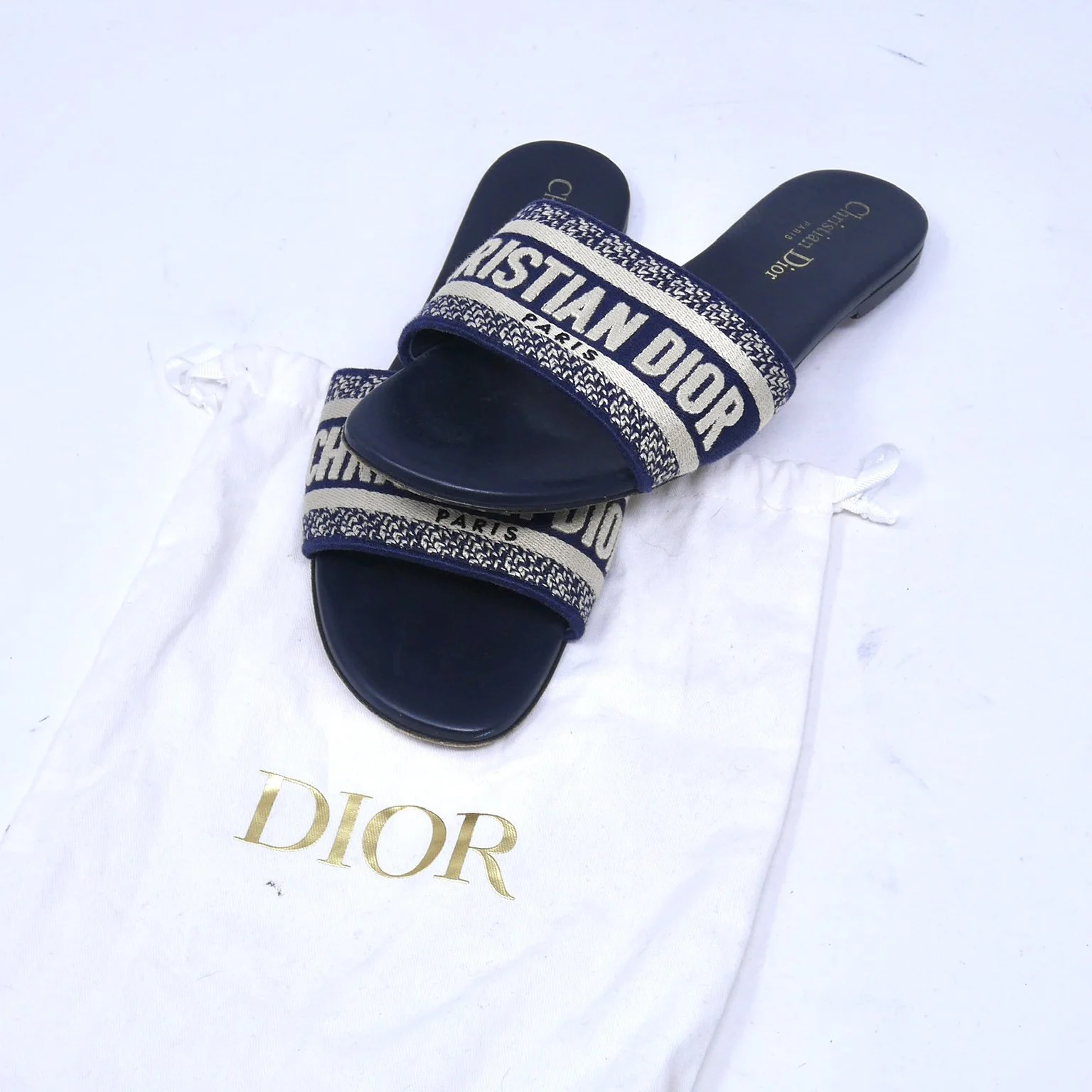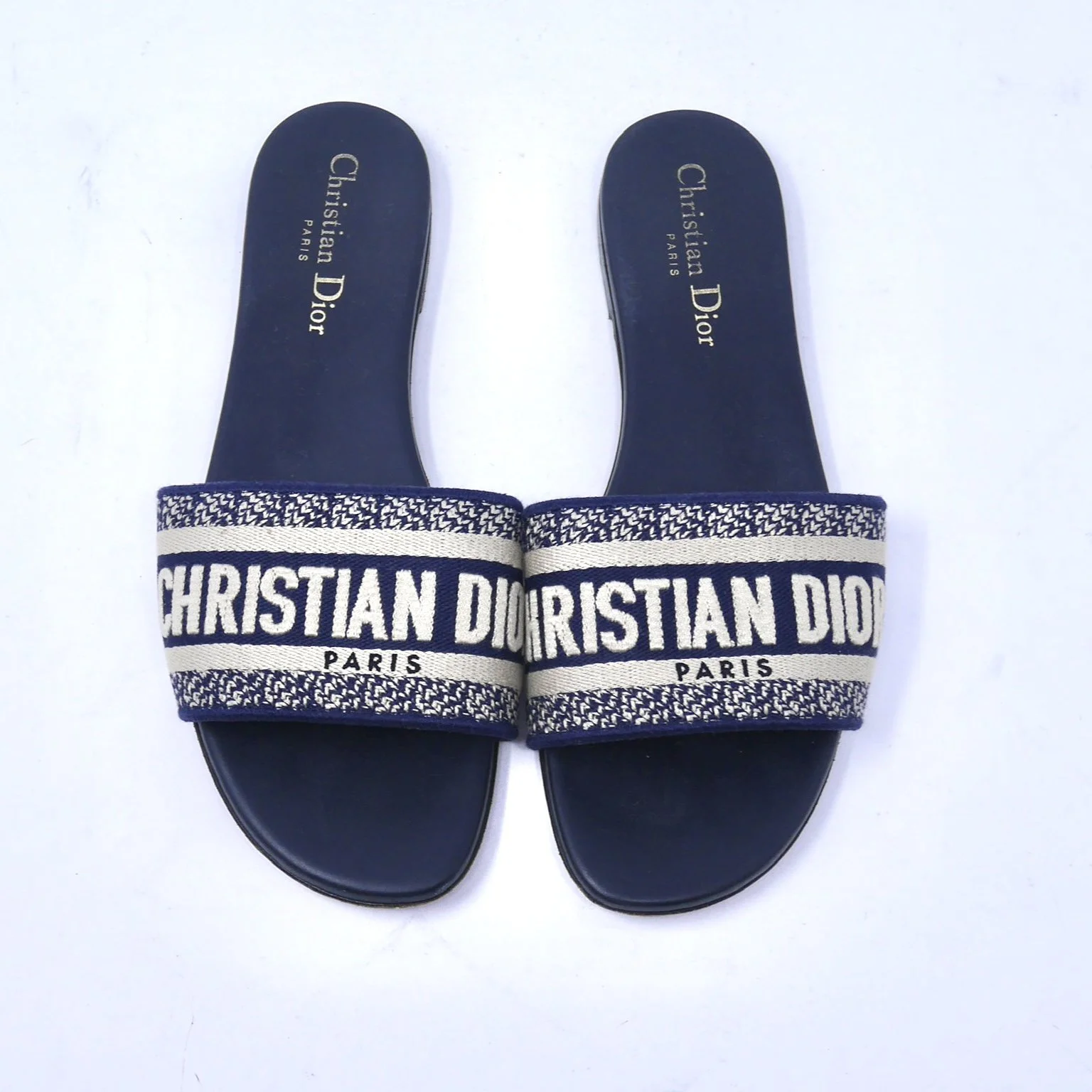 Iconic Christian Dior “Dway” slide sandals featuring the instantly recognisable navy Oblique embroidered strap with bold CHRISTIAN DIOR PARIS branding.