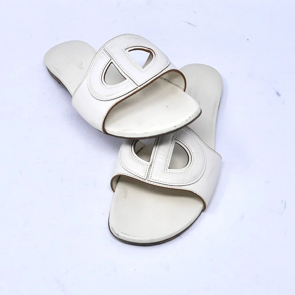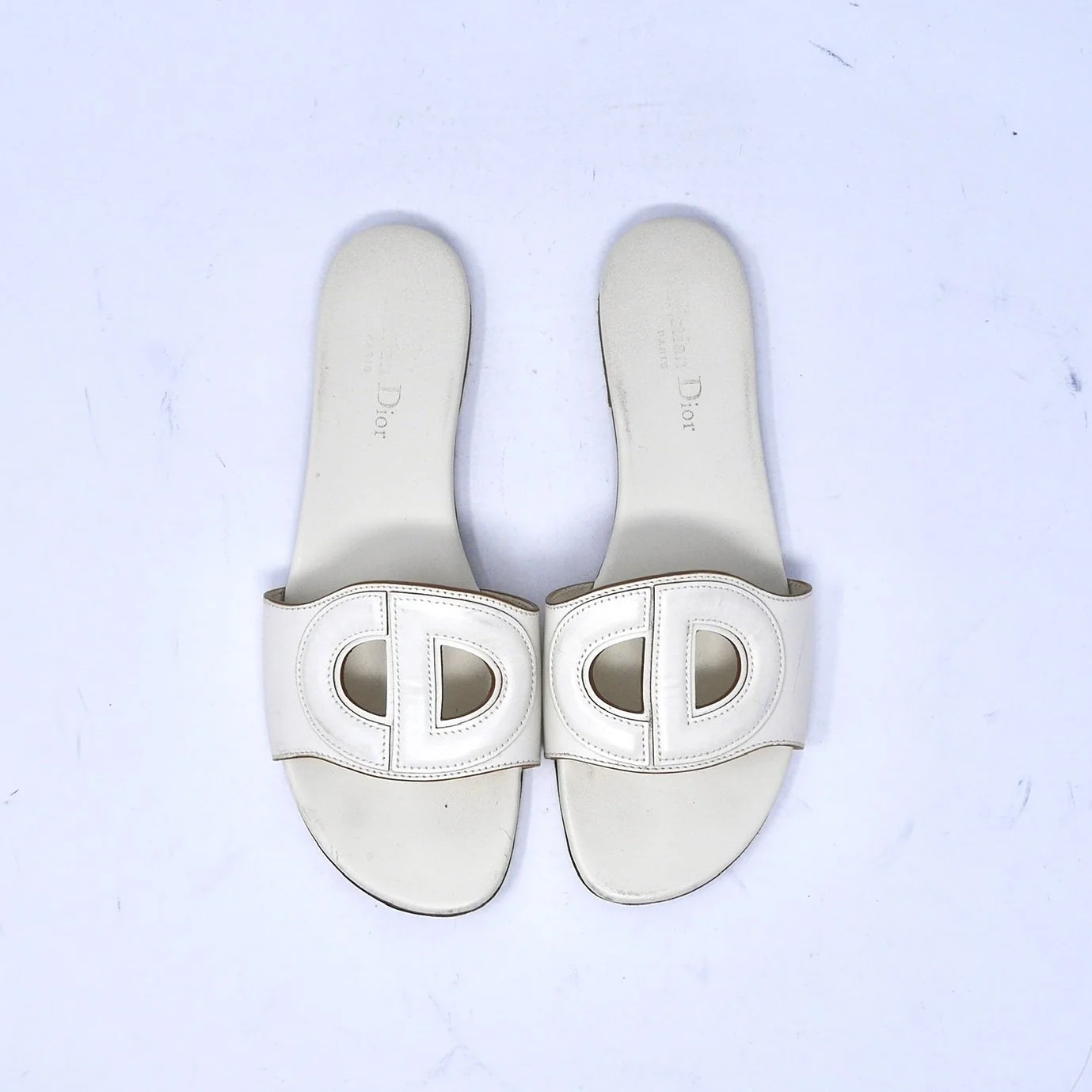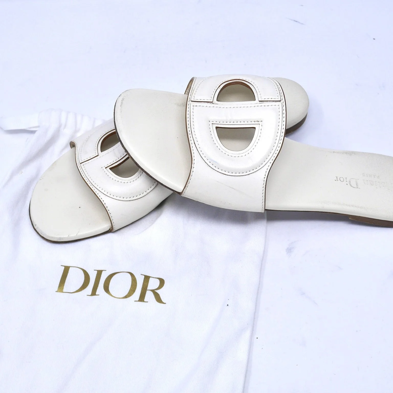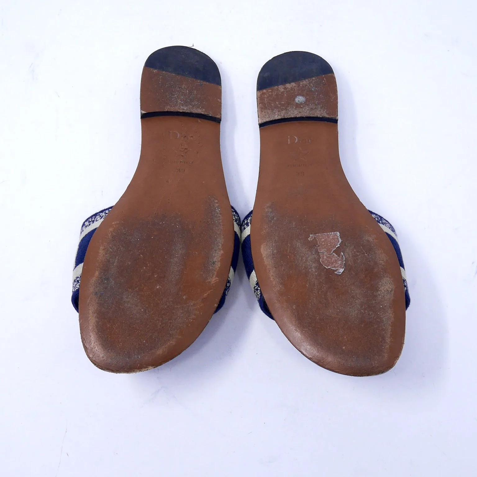 Iconic Christian Dior “Dway” slide sandals featuring the instantly recognisable navy Oblique embroidered strap with bold CHRISTIAN DIOR PARIS branding.