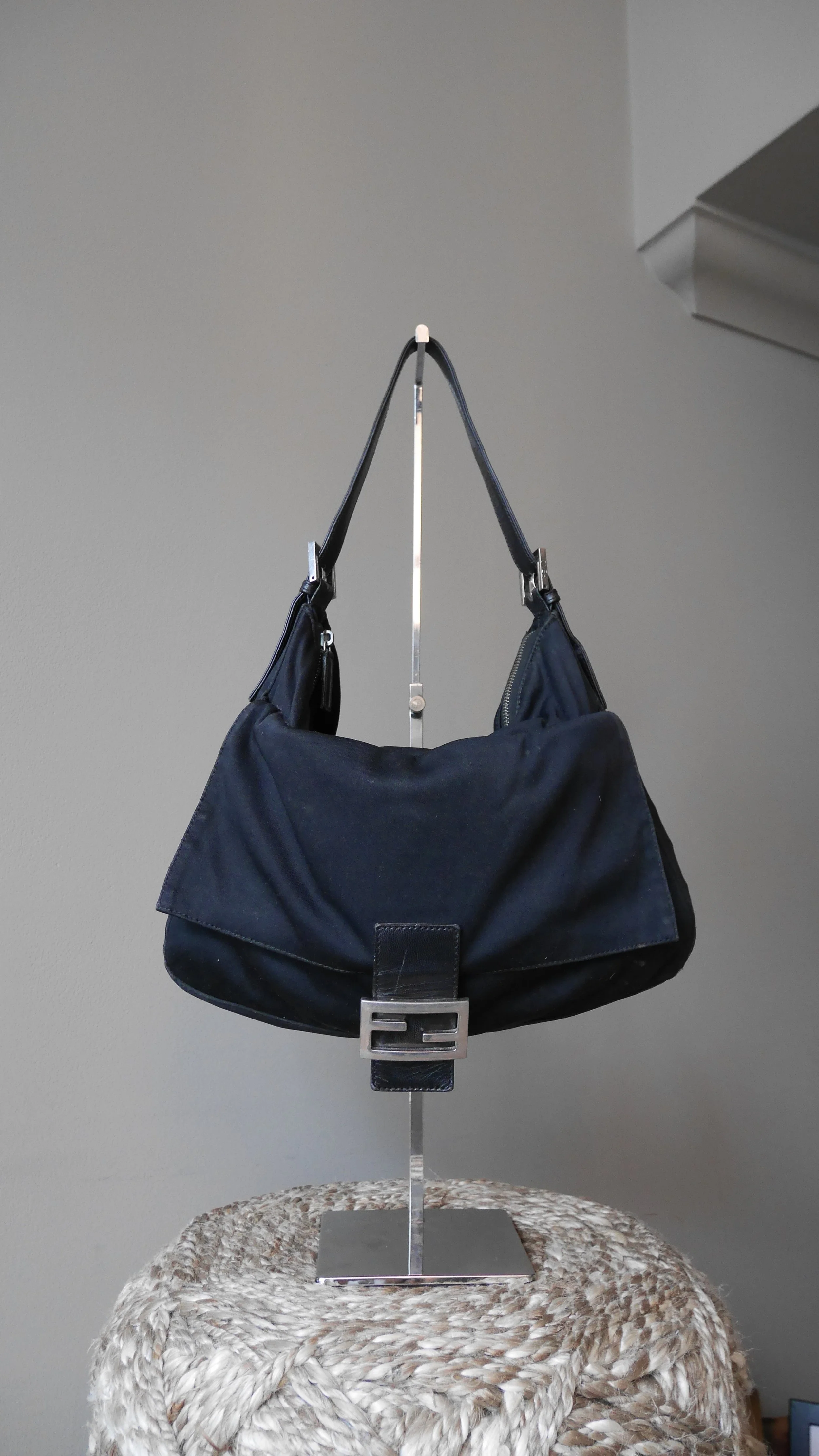 Elevate your style with this chic Fendi Baguette Mama bag, crafted from durable black nylon. The bag features the iconic Fendi logo in a shiny silver-tone finish, adding a touch of sophistication and luxury to the design.