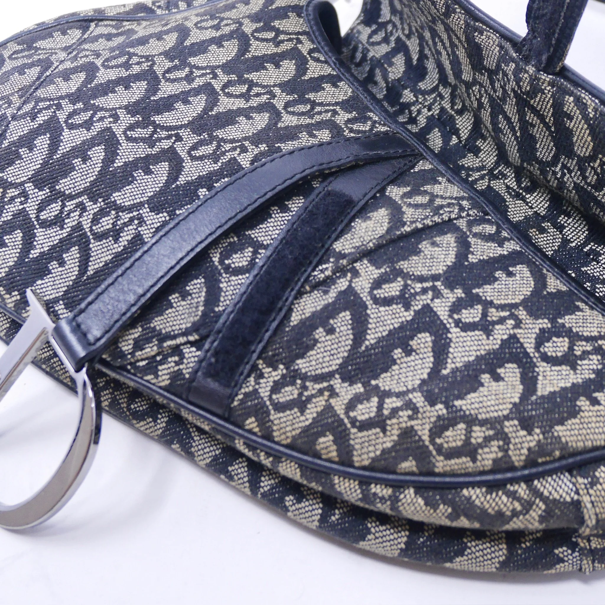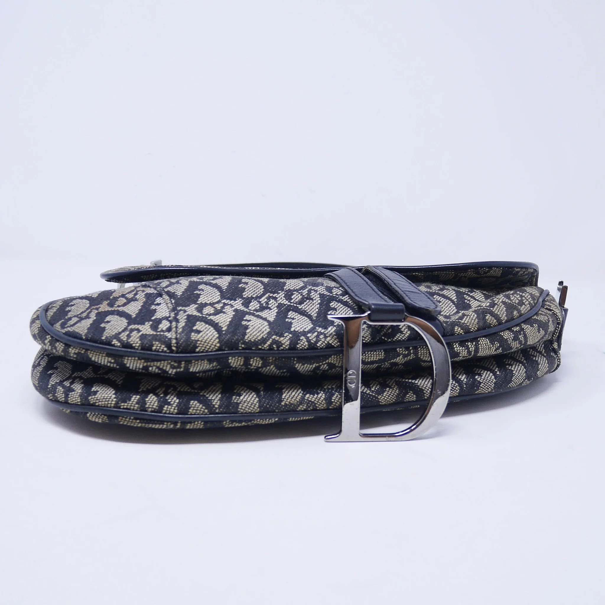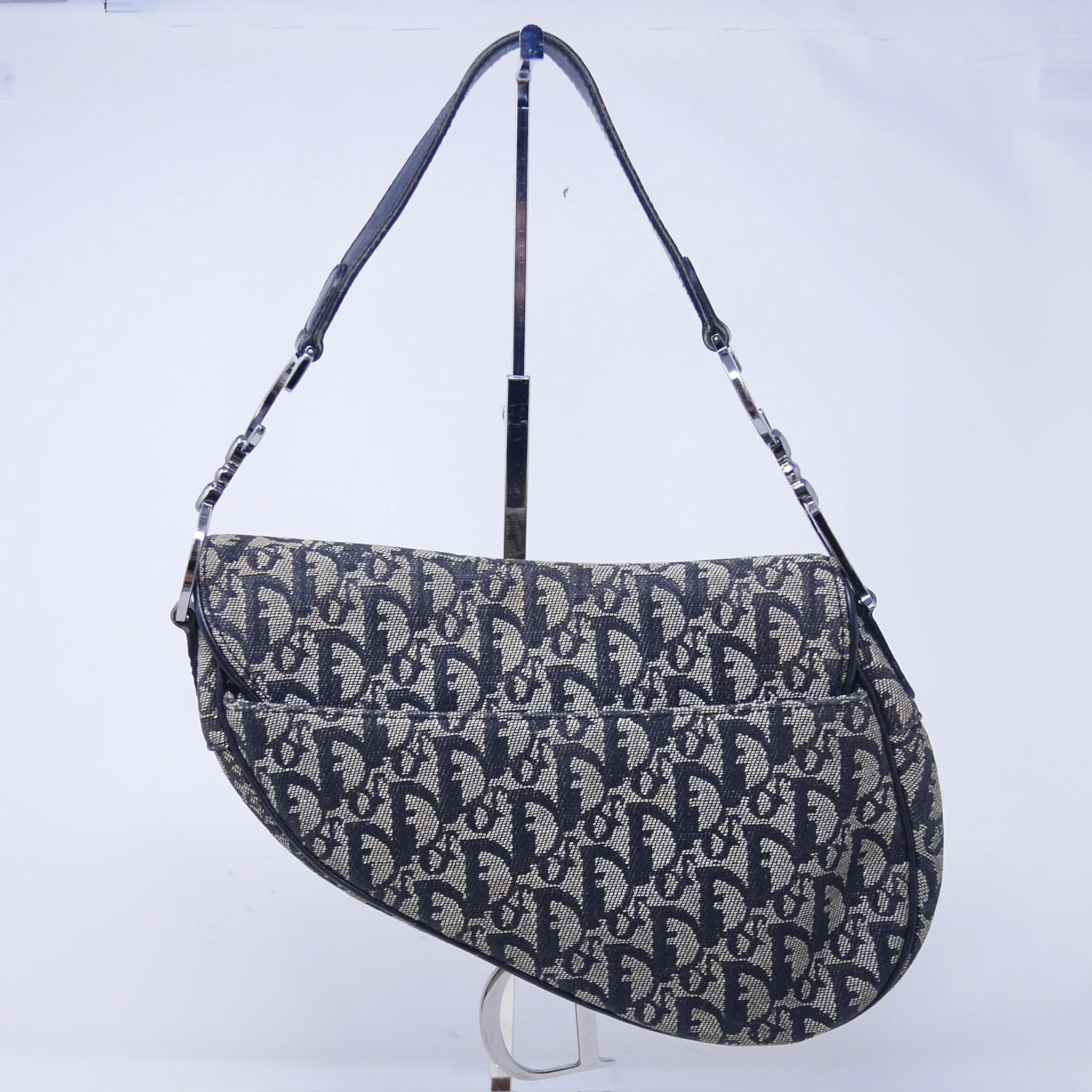Iconic Dior Saddle bag crafted in navy Oblique jacquard canvas with tonal leather trim and signature silver-tone “D” hardware. A timeless early-2000s design featuring the distinctive curved silhouette and adjustable shoulder strap.