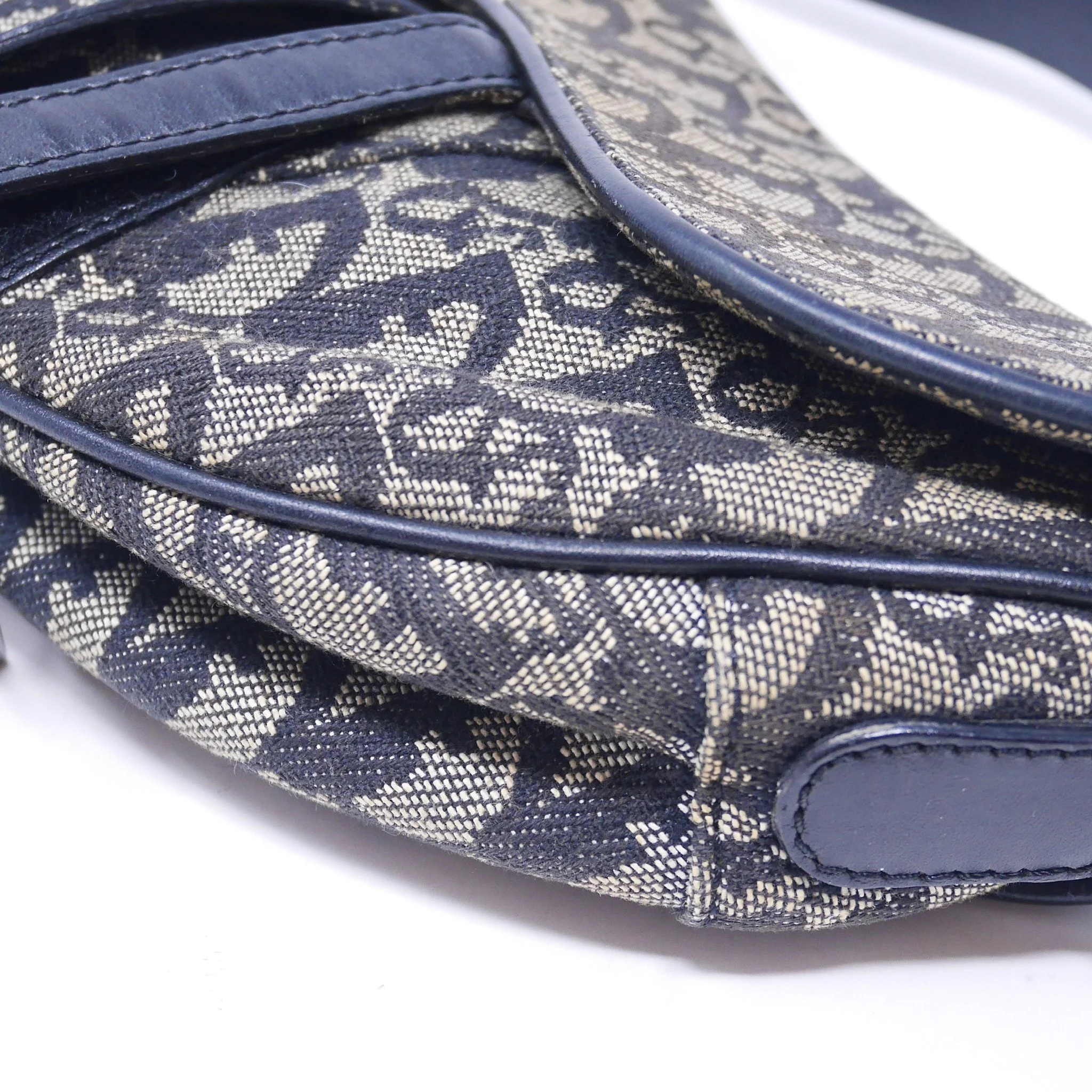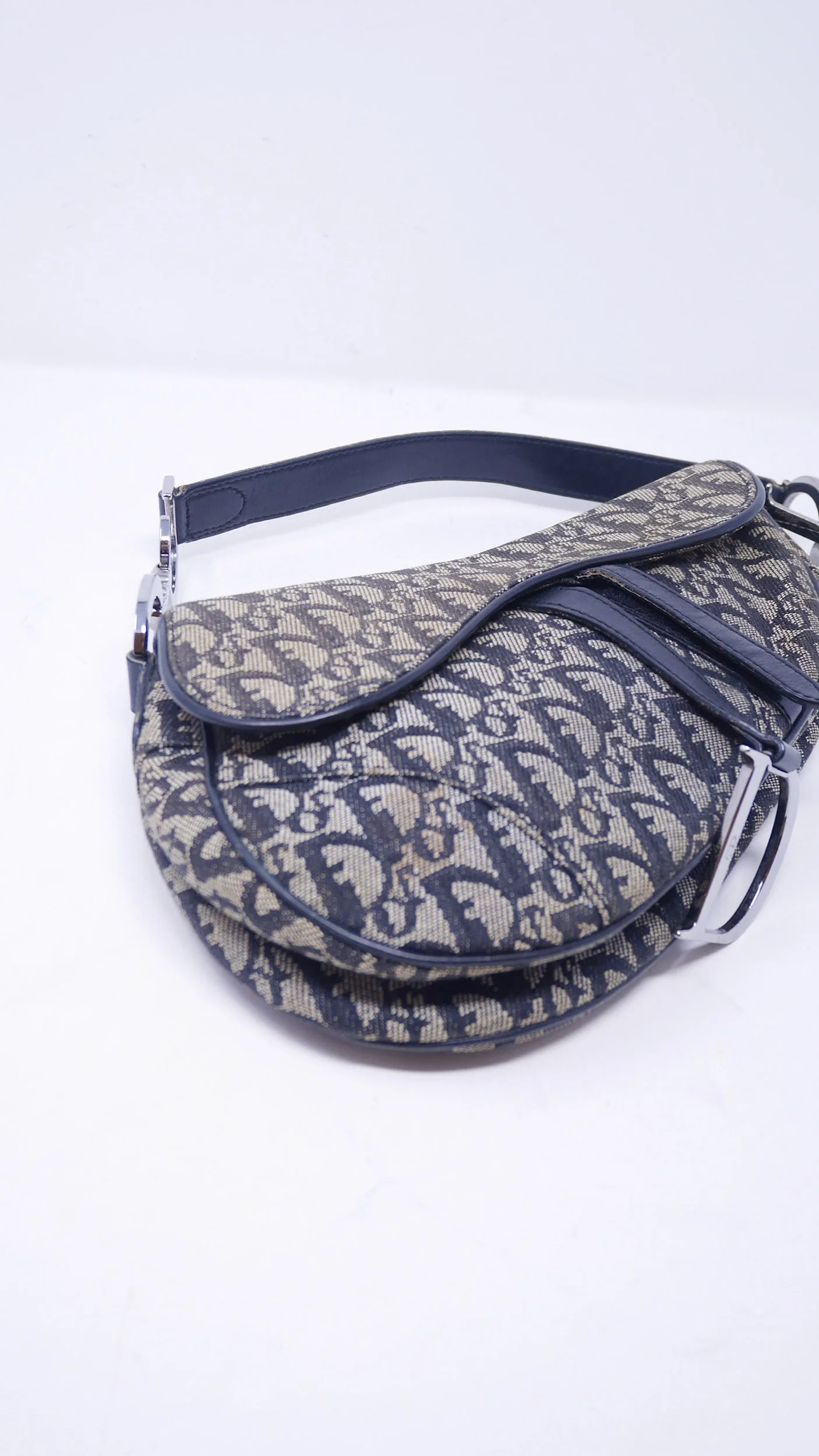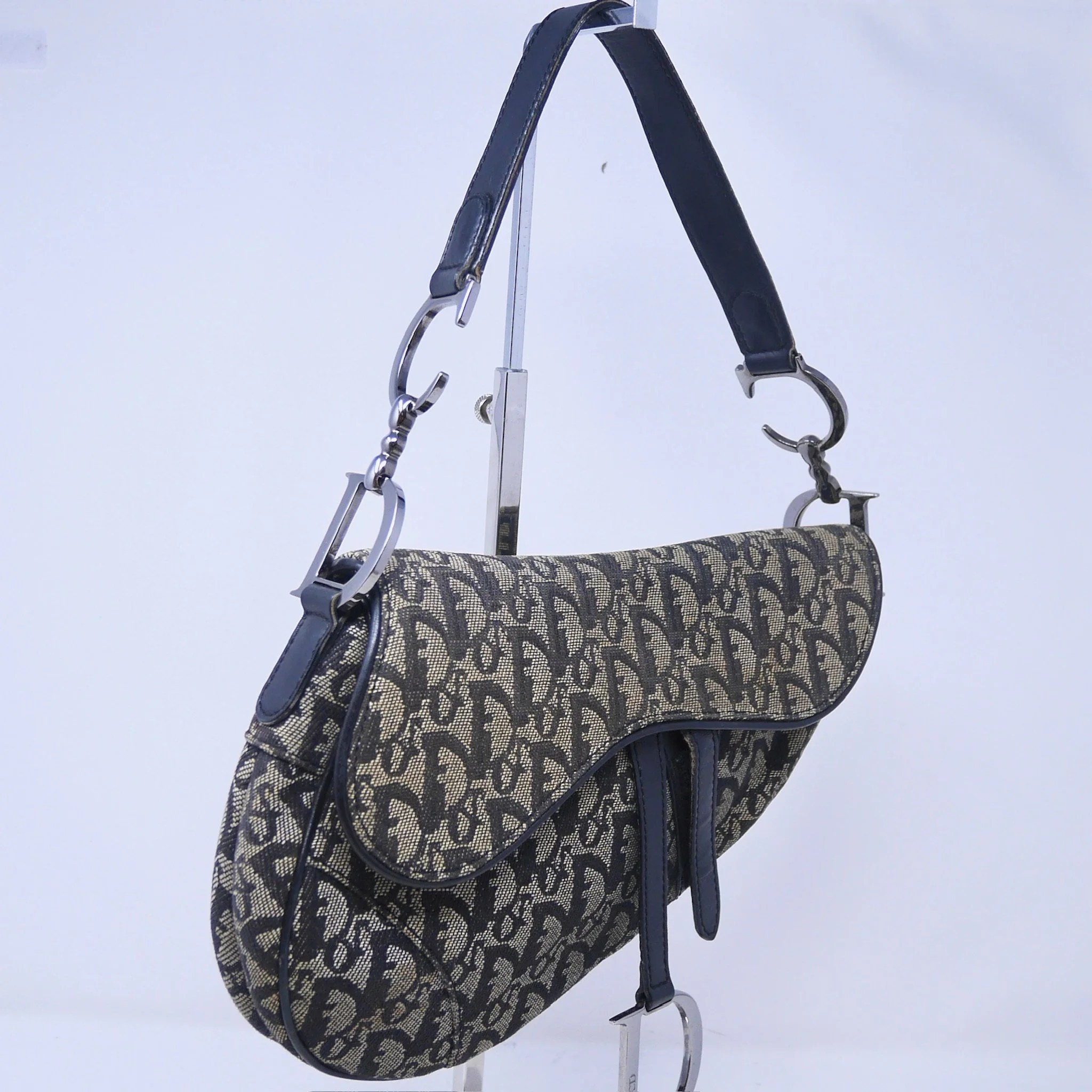 Iconic Dior Saddle bag crafted in navy Oblique jacquard canvas with tonal leather trim and signature silver-tone “D” hardware. A timeless early-2000s design featuring the distinctive curved silhouette and adjustable shoulder strap.