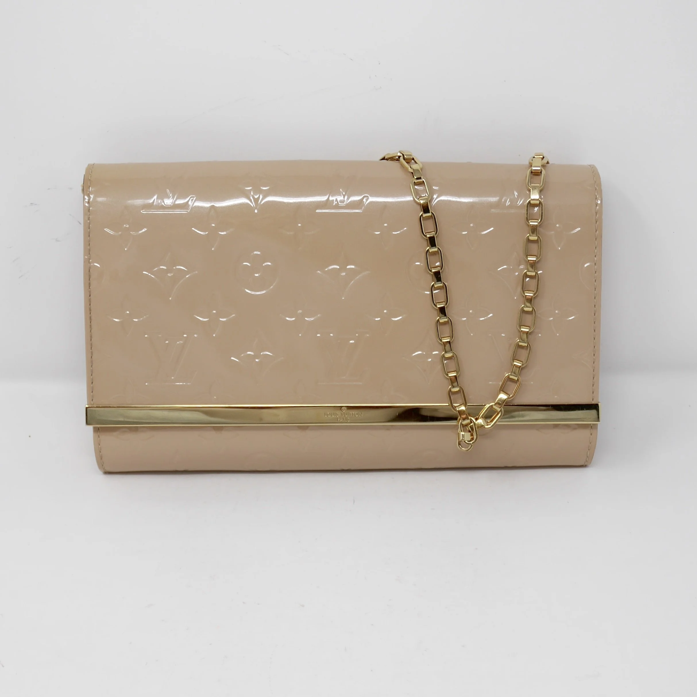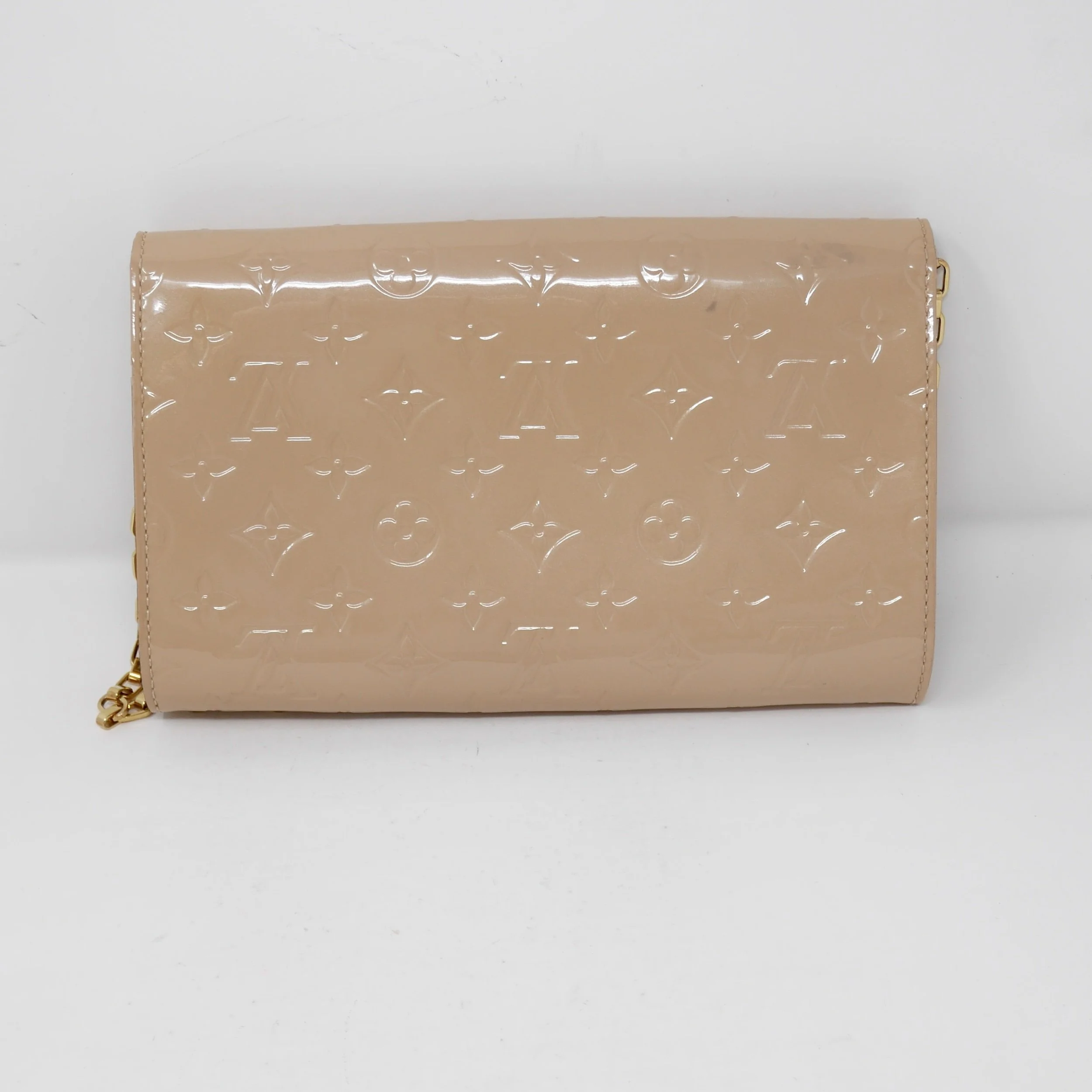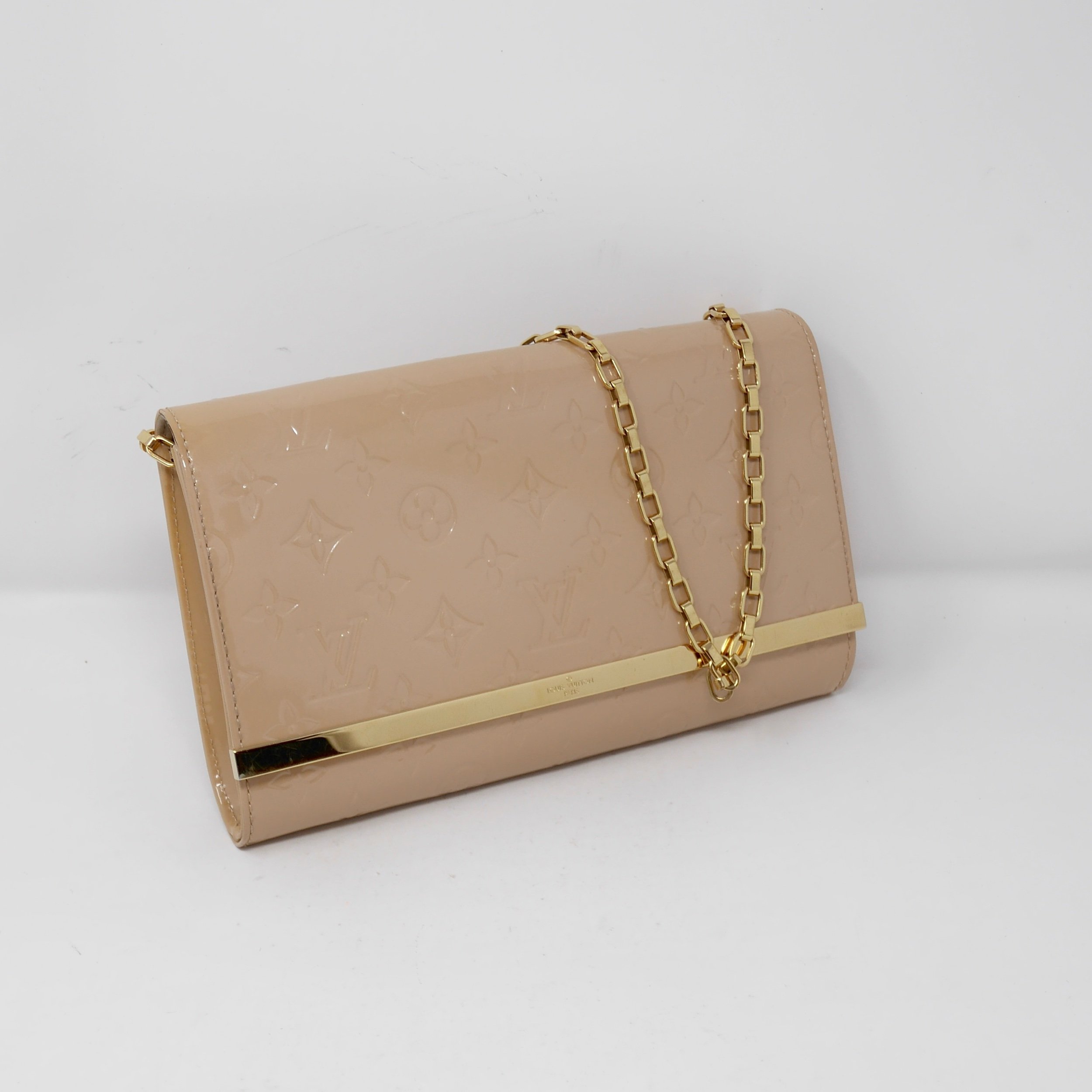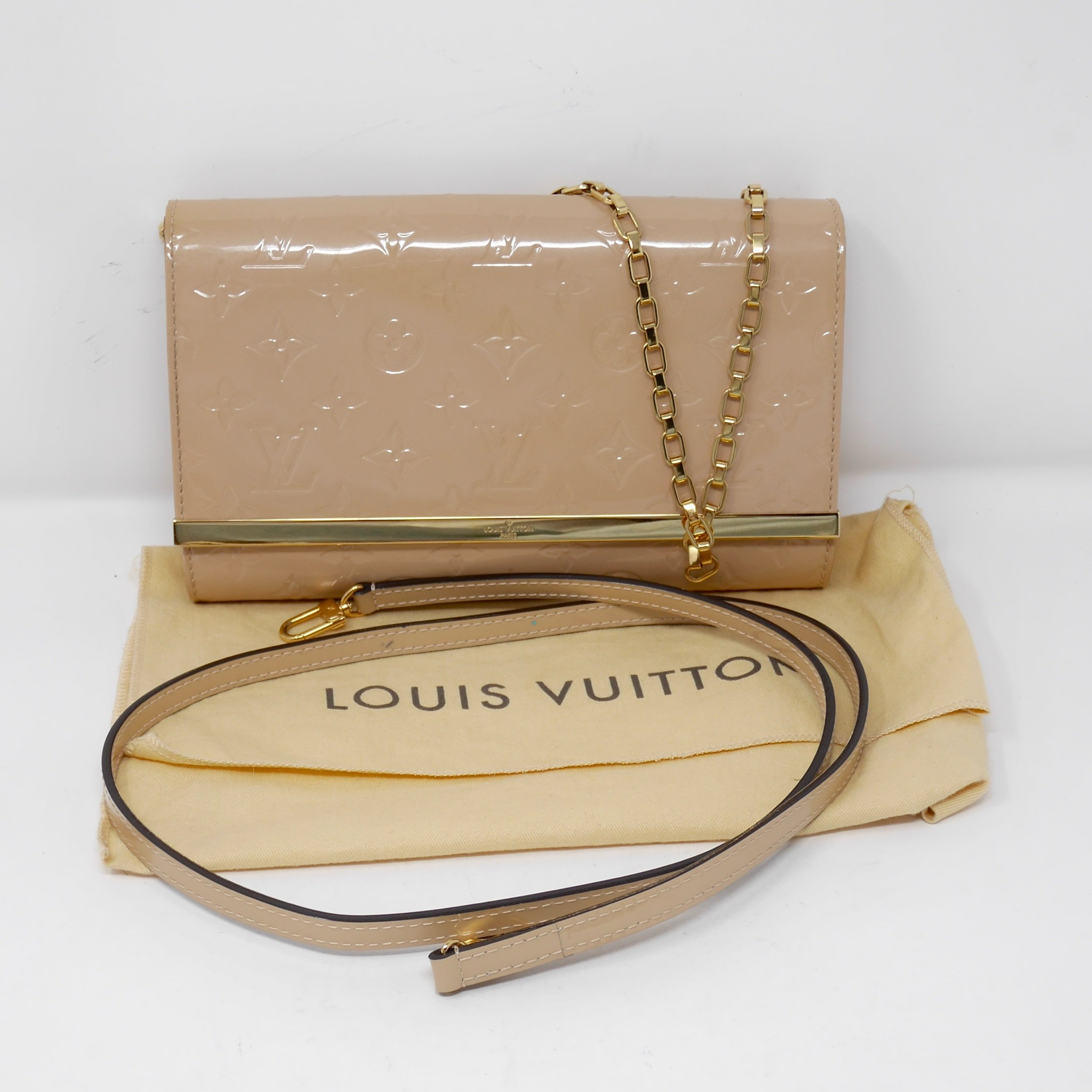 A sophisticated Louis Vuitton Ana Chain Wallet in glossy nude Monogram Vernis patent leather. Detailed with a gold-tone LV logo bar trim and detachable chain and leather straps for versatile wear as a clutch, shoulder, or crossbody bag. The perfect combination of timeless elegance and practicality.