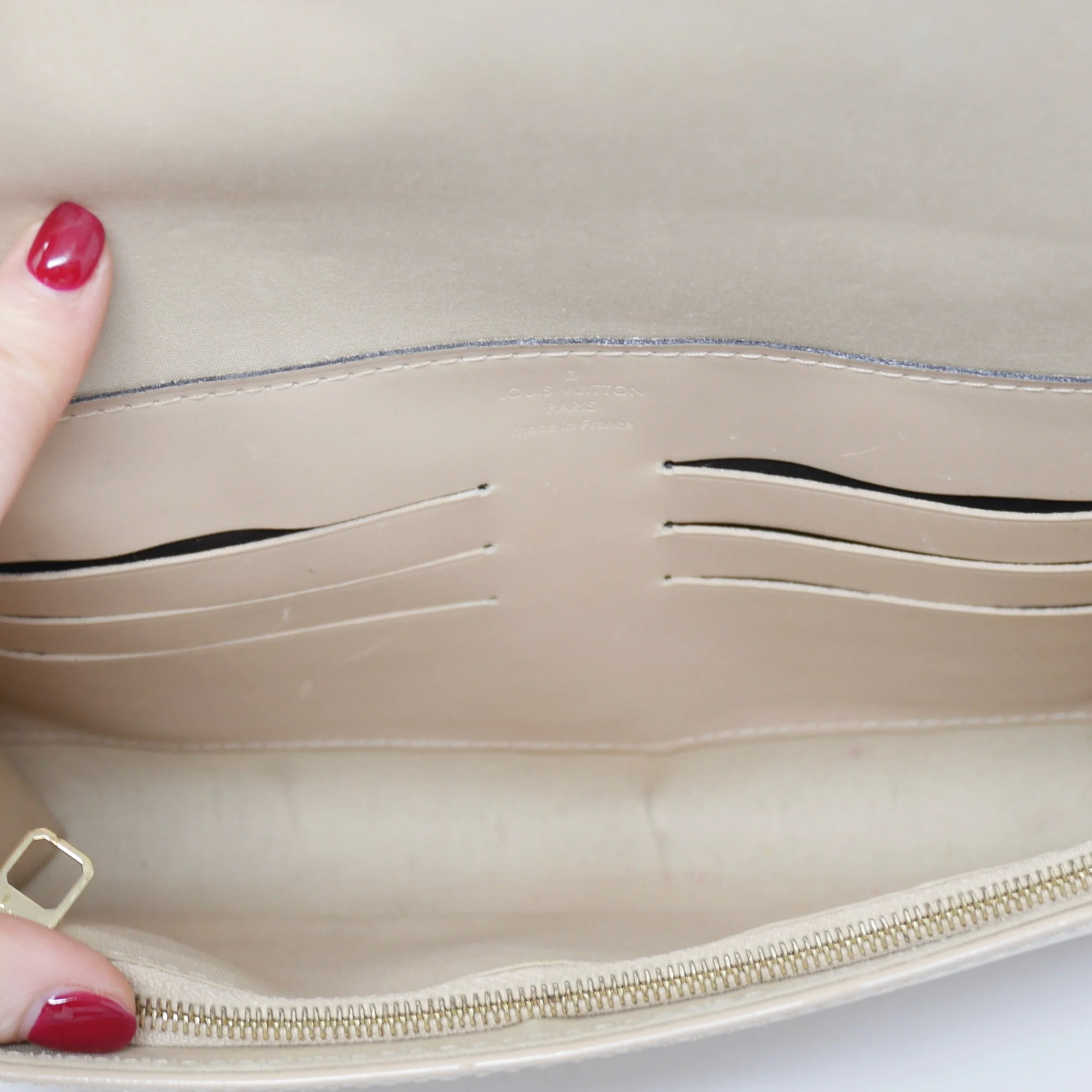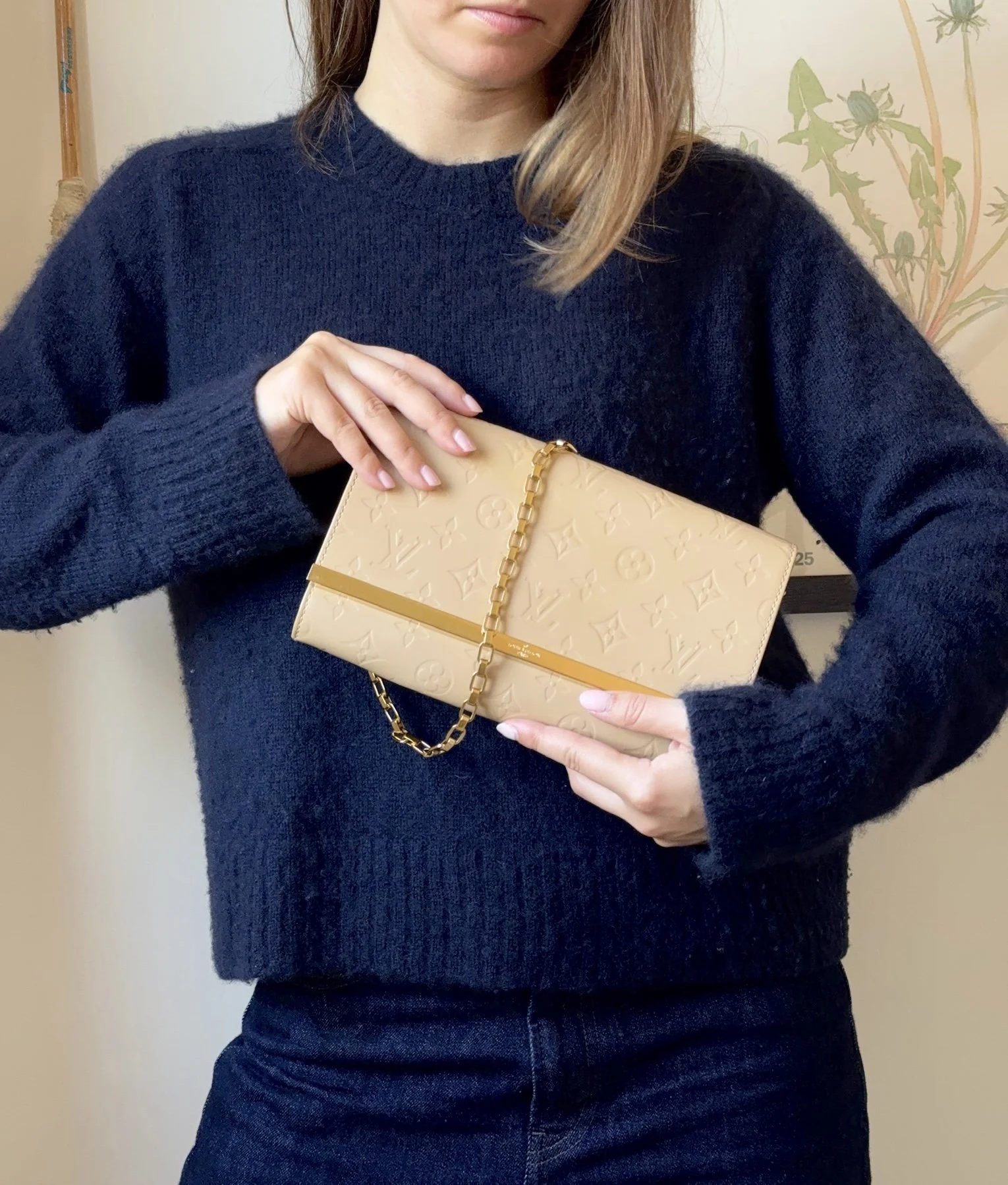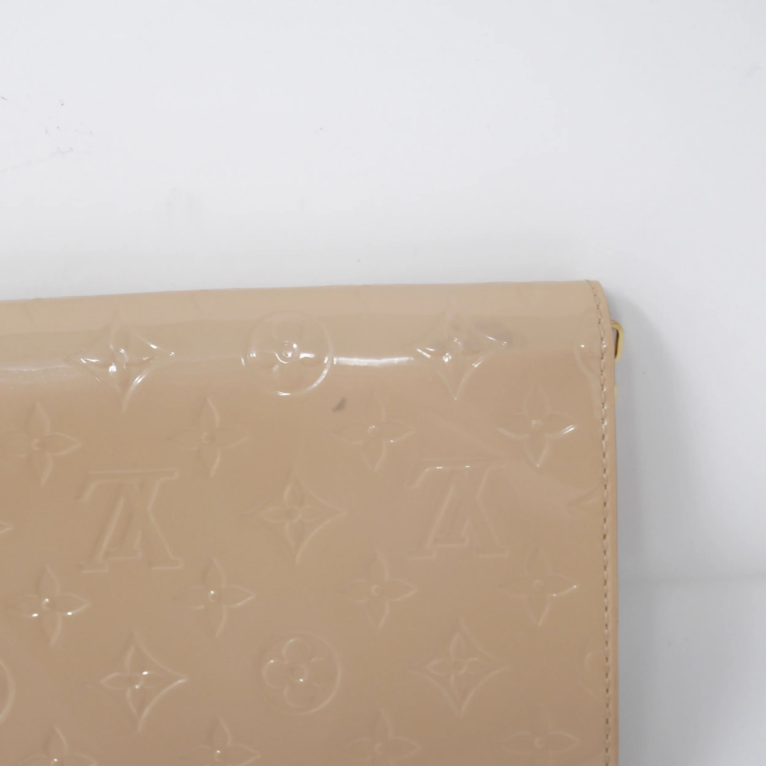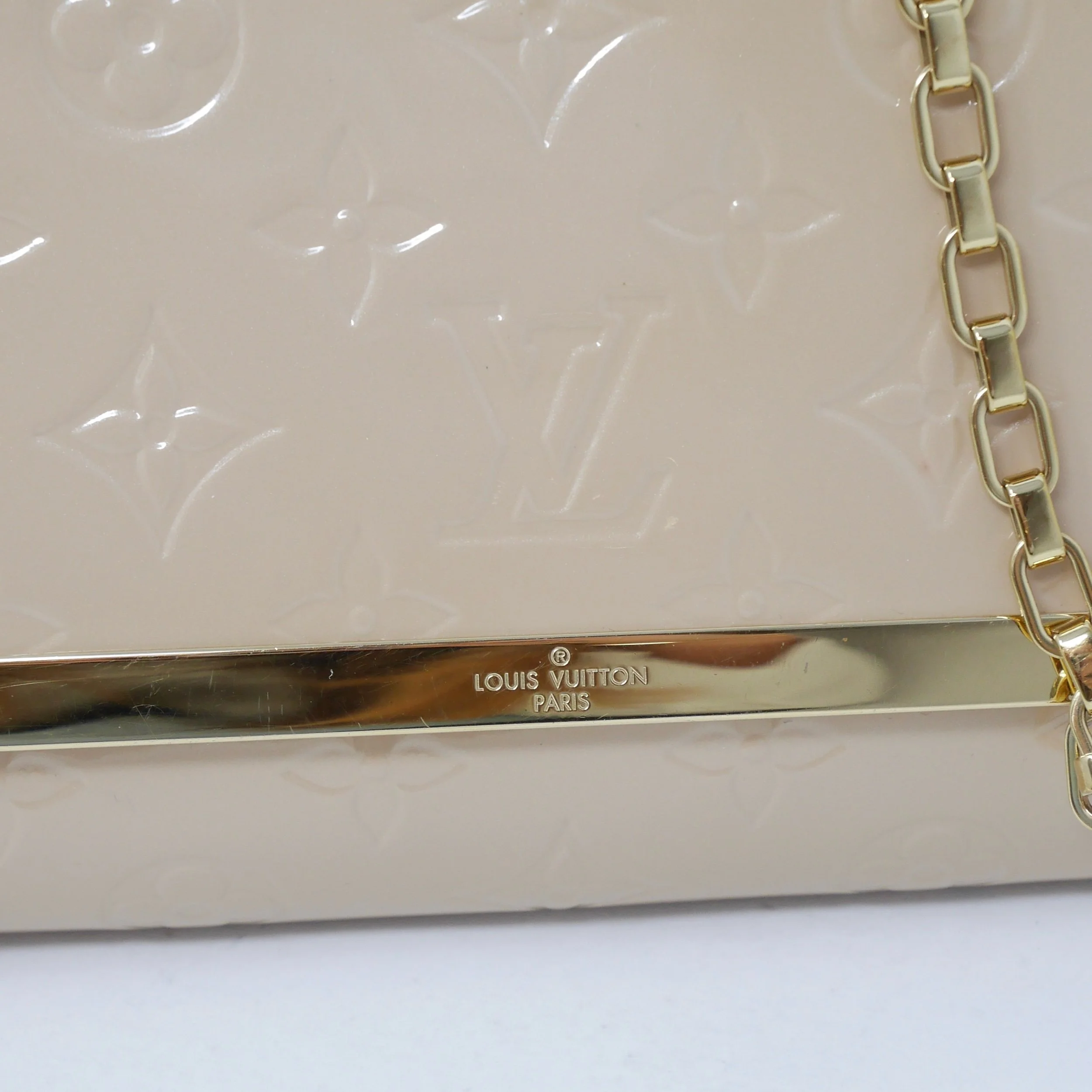 A sophisticated Louis Vuitton Ana Chain Wallet in glossy nude Monogram Vernis patent leather. Detailed with a gold-tone LV logo bar trim and detachable chain and leather straps for versatile wear as a clutch, shoulder, or crossbody bag. The perfect combination of timeless elegance and practicality.