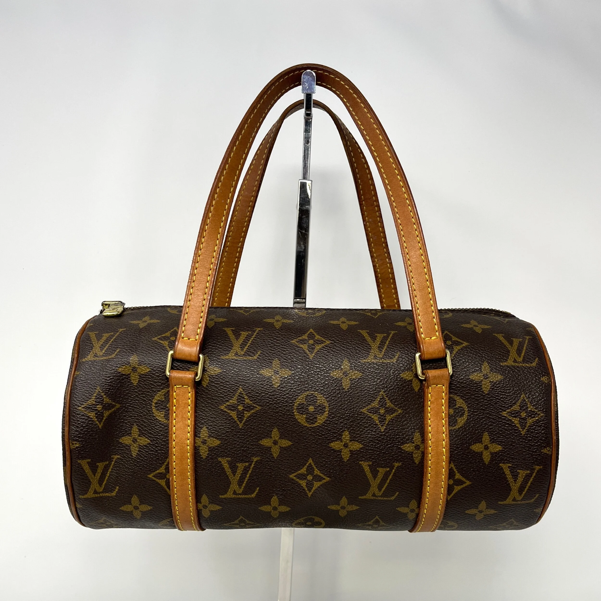 Crafted from Louis Vuitton's iconic Monogram canvas, the Papillon bag boasts a unique cylindrical shape with natural cowhide leather trims and dual rounded handles that allow for comfortable hand or arm carry.