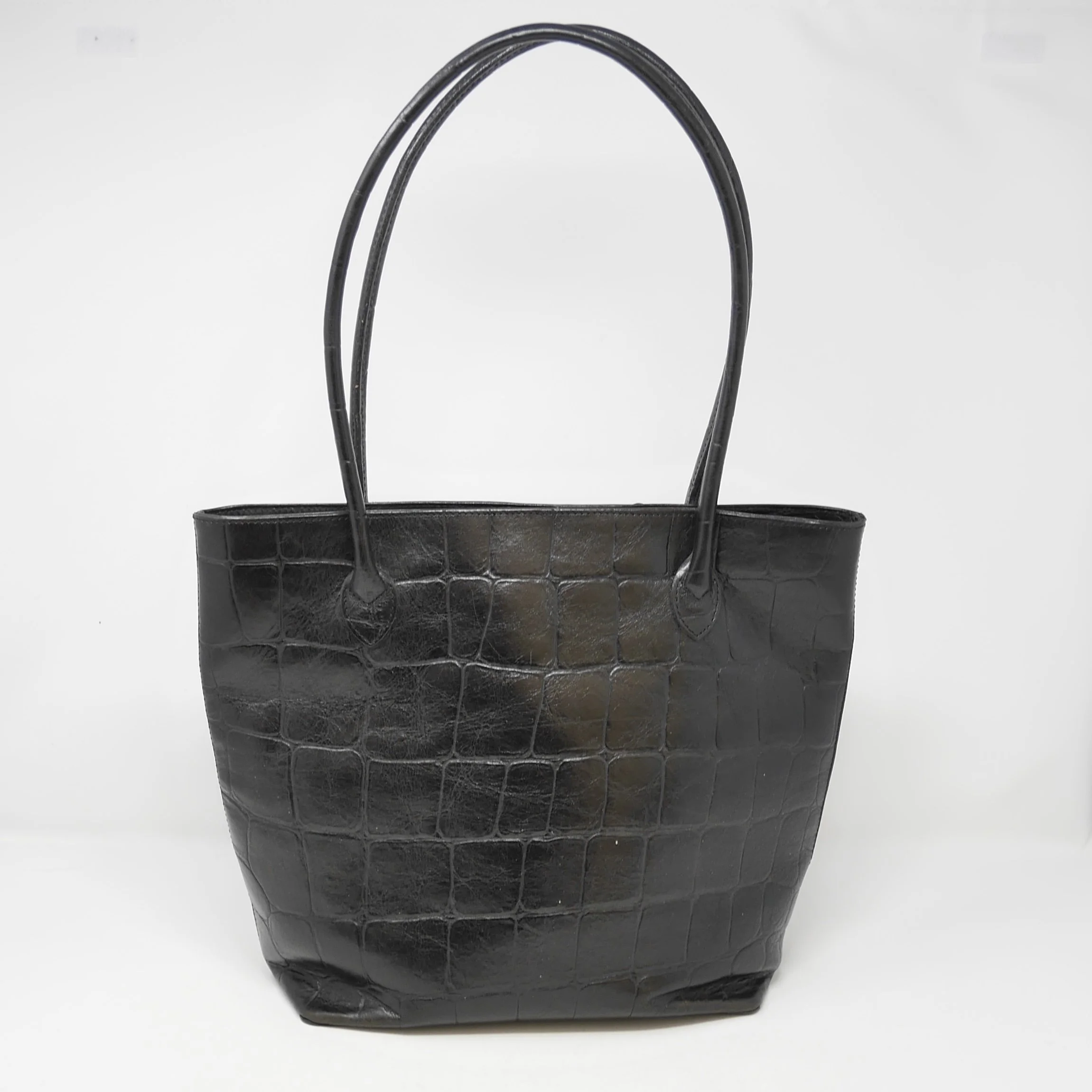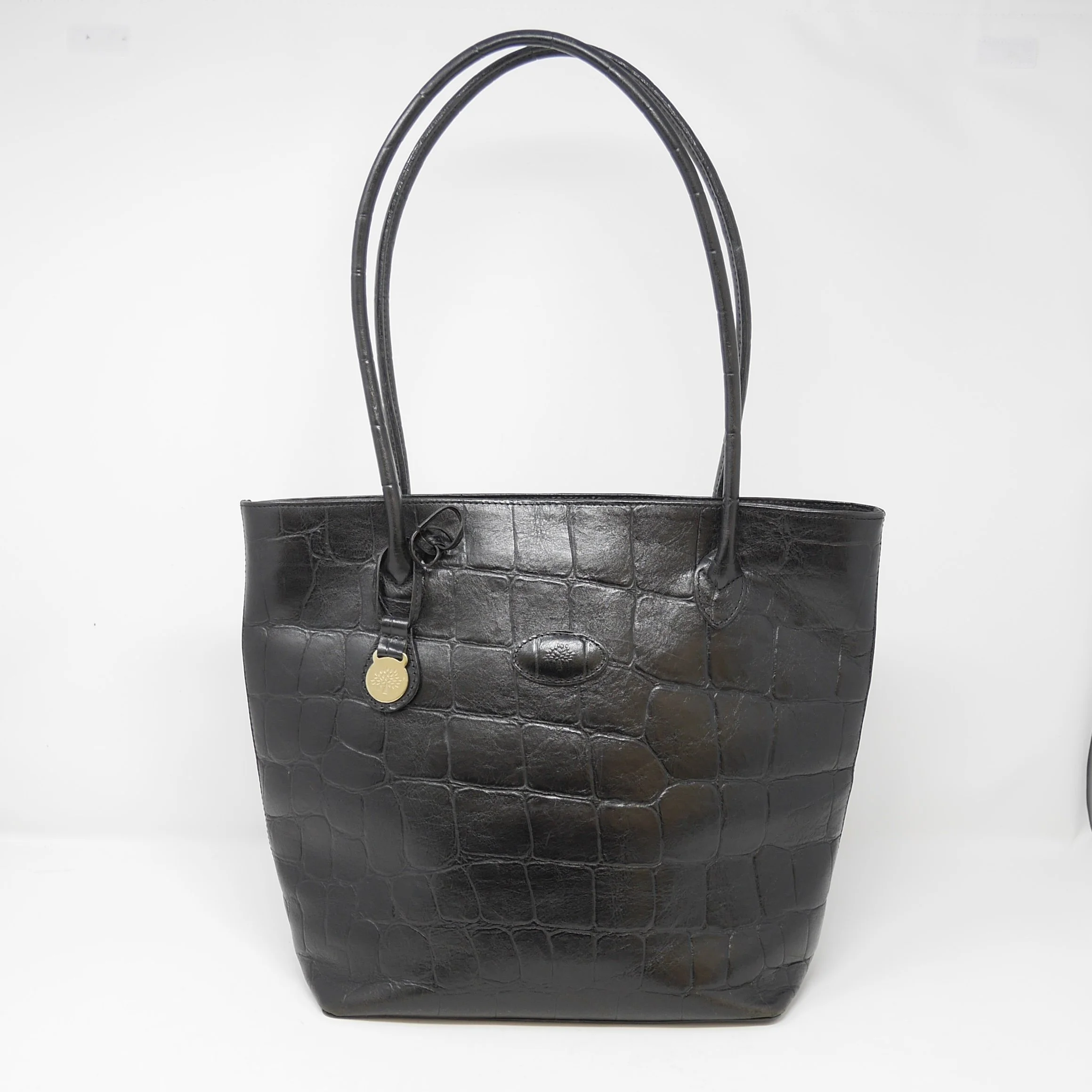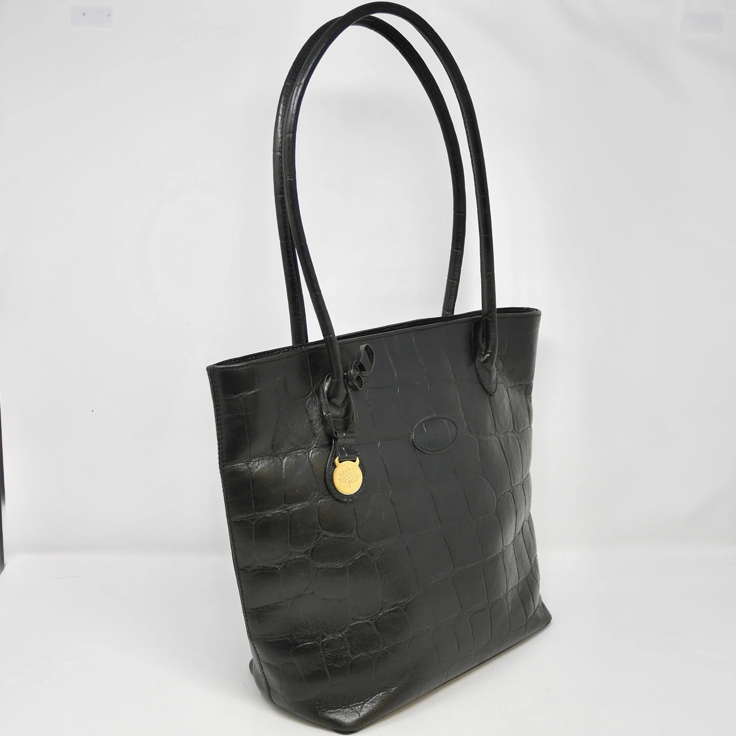 Elegant Mulberry tote bag in glossy black croc-embossed leather. Featuring slim dual shoulder straps and a spacious open-top design, this piece balances sophistication and practicality.