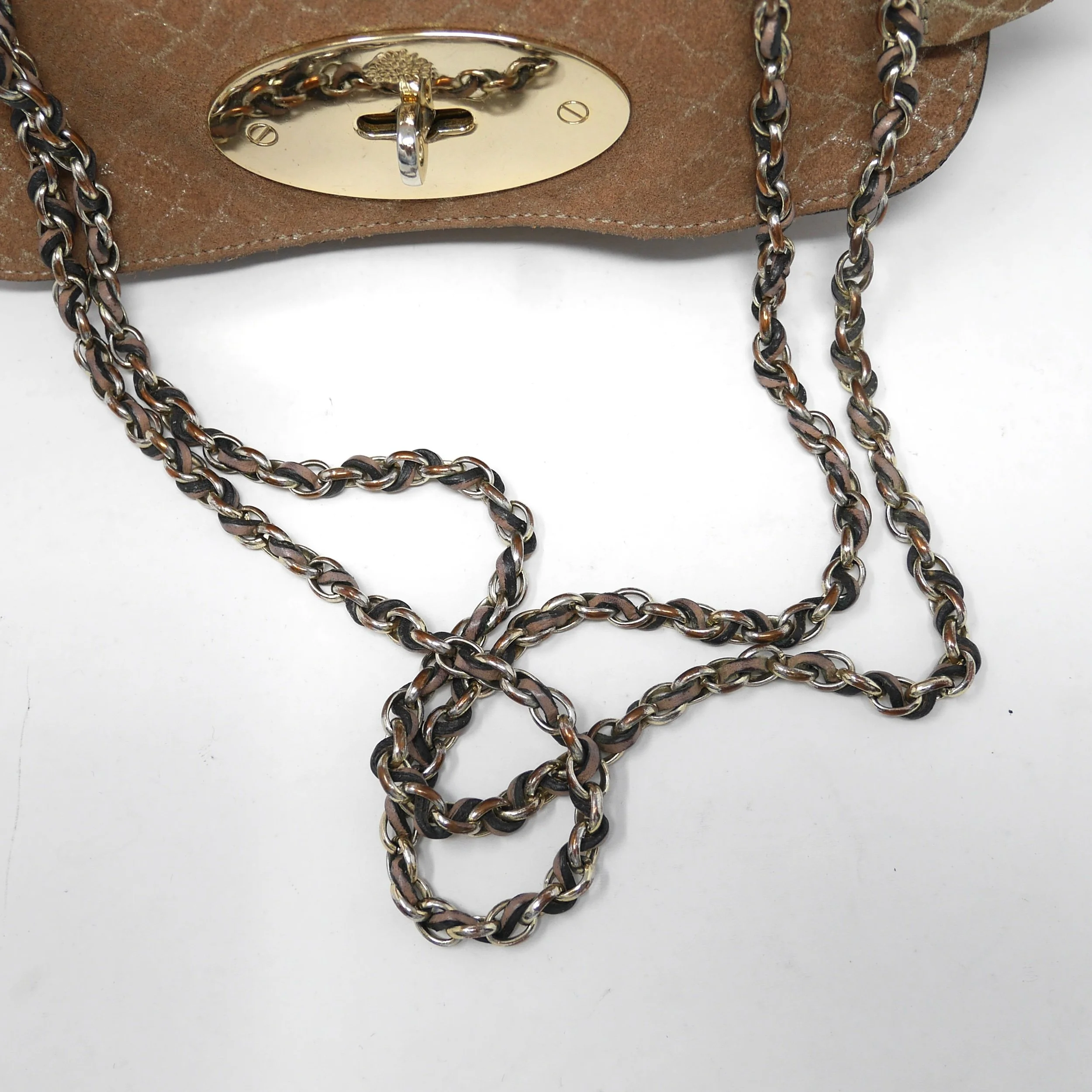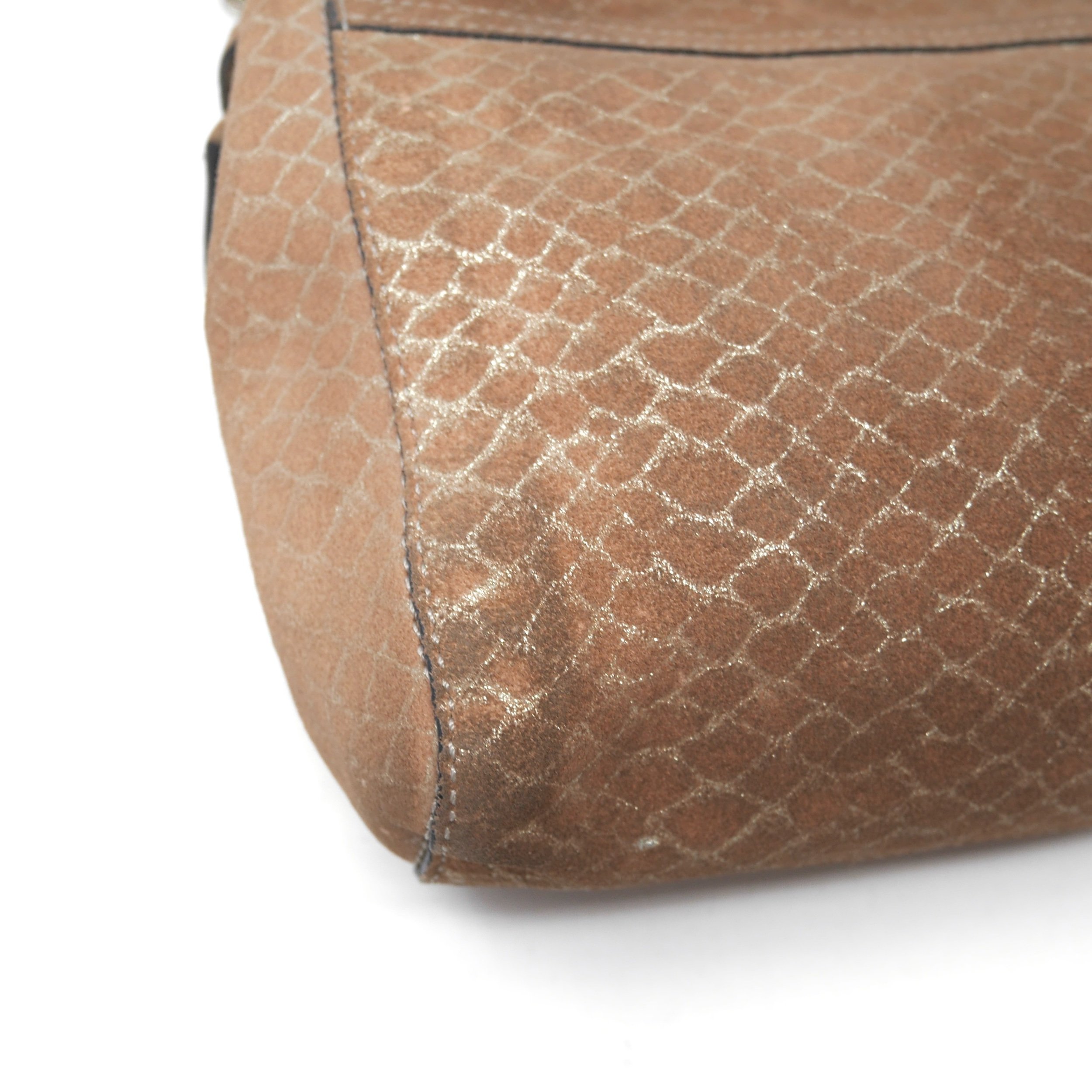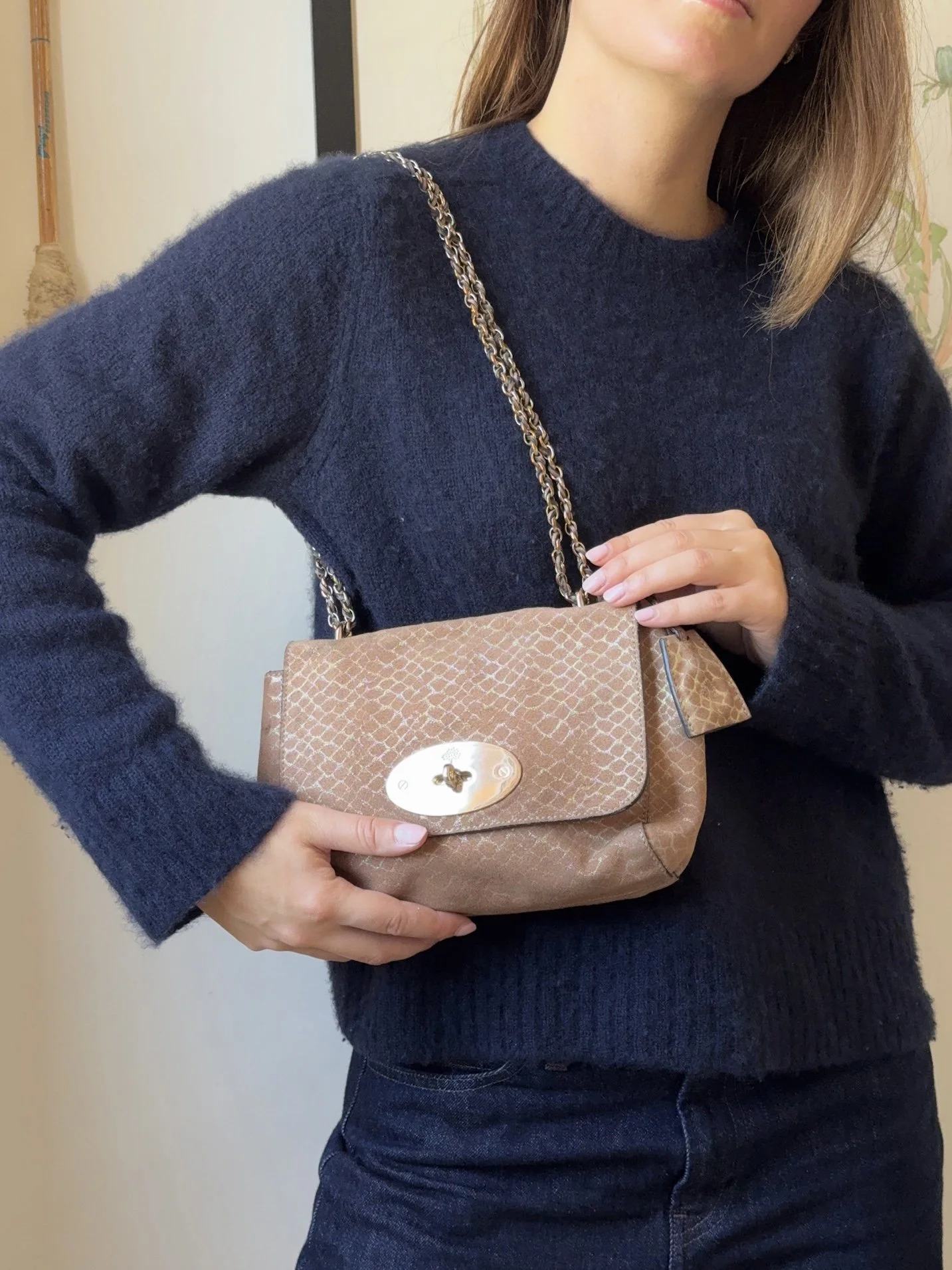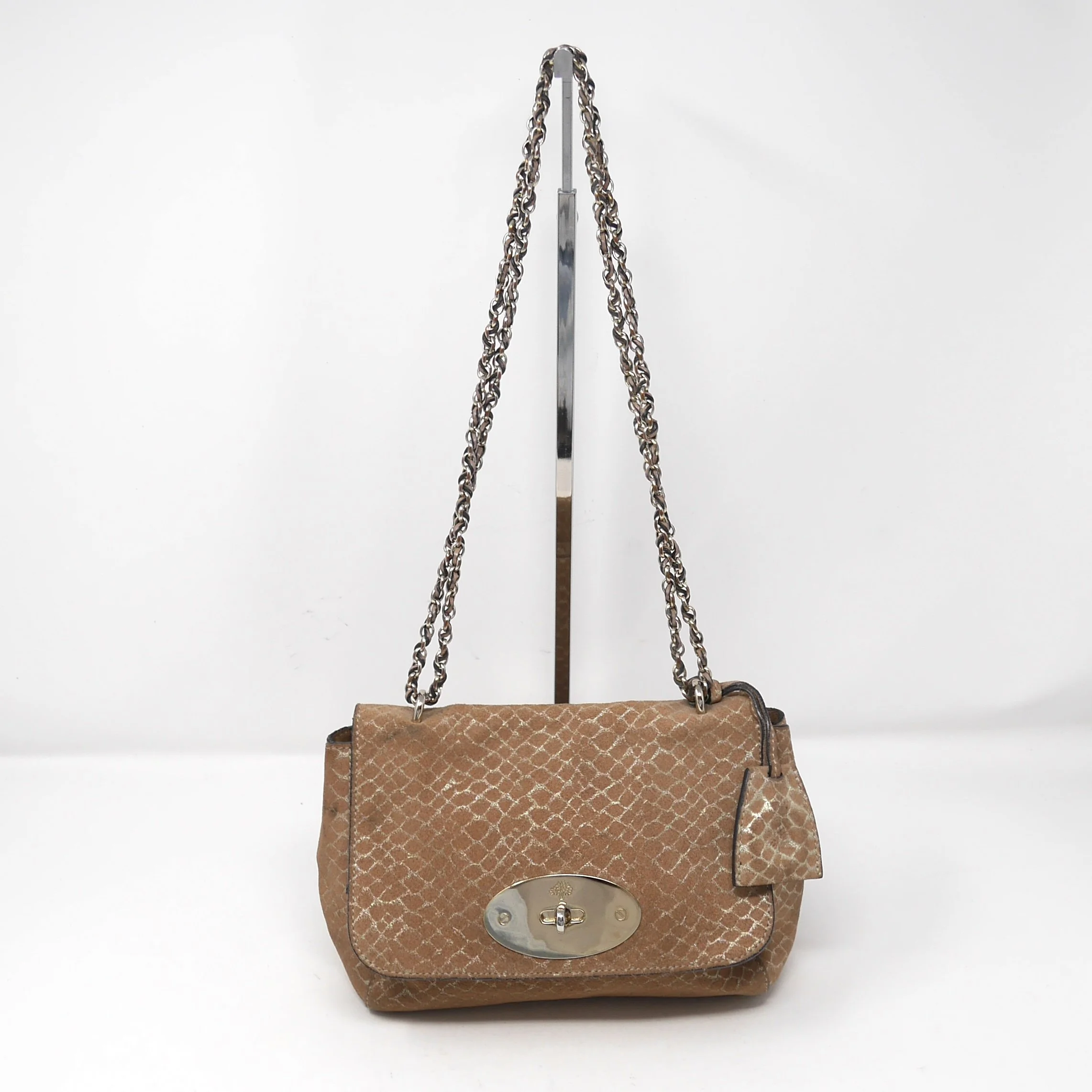 A beautifully crafted Mulberry Lily shoulder bag in metallic tan python-effect suede, combining timeless British craftsmanship with a touch of understated glamour. Finished with the signature postman’s lock and chain strap, this is a versatile piece that can be styled from day to evening with ease.