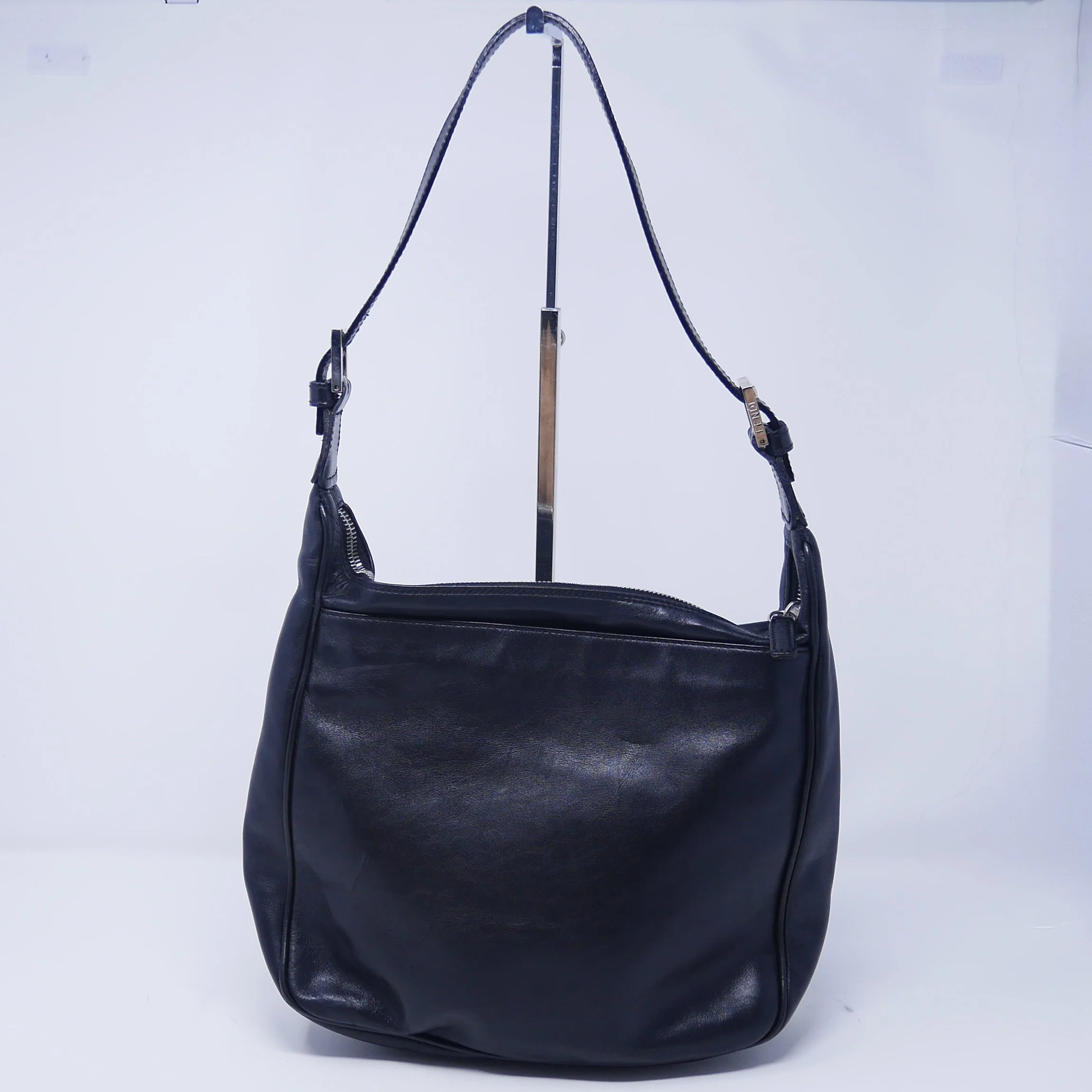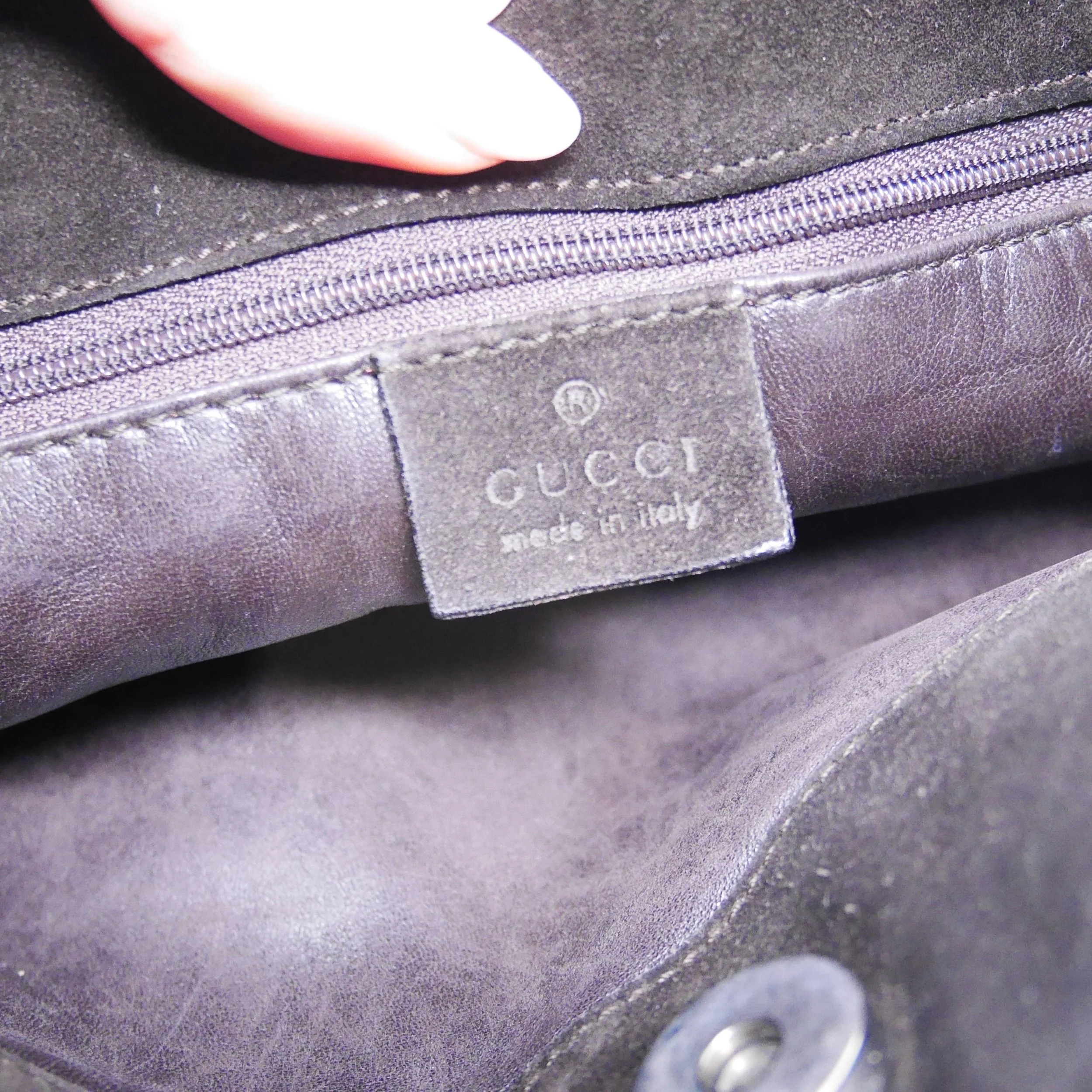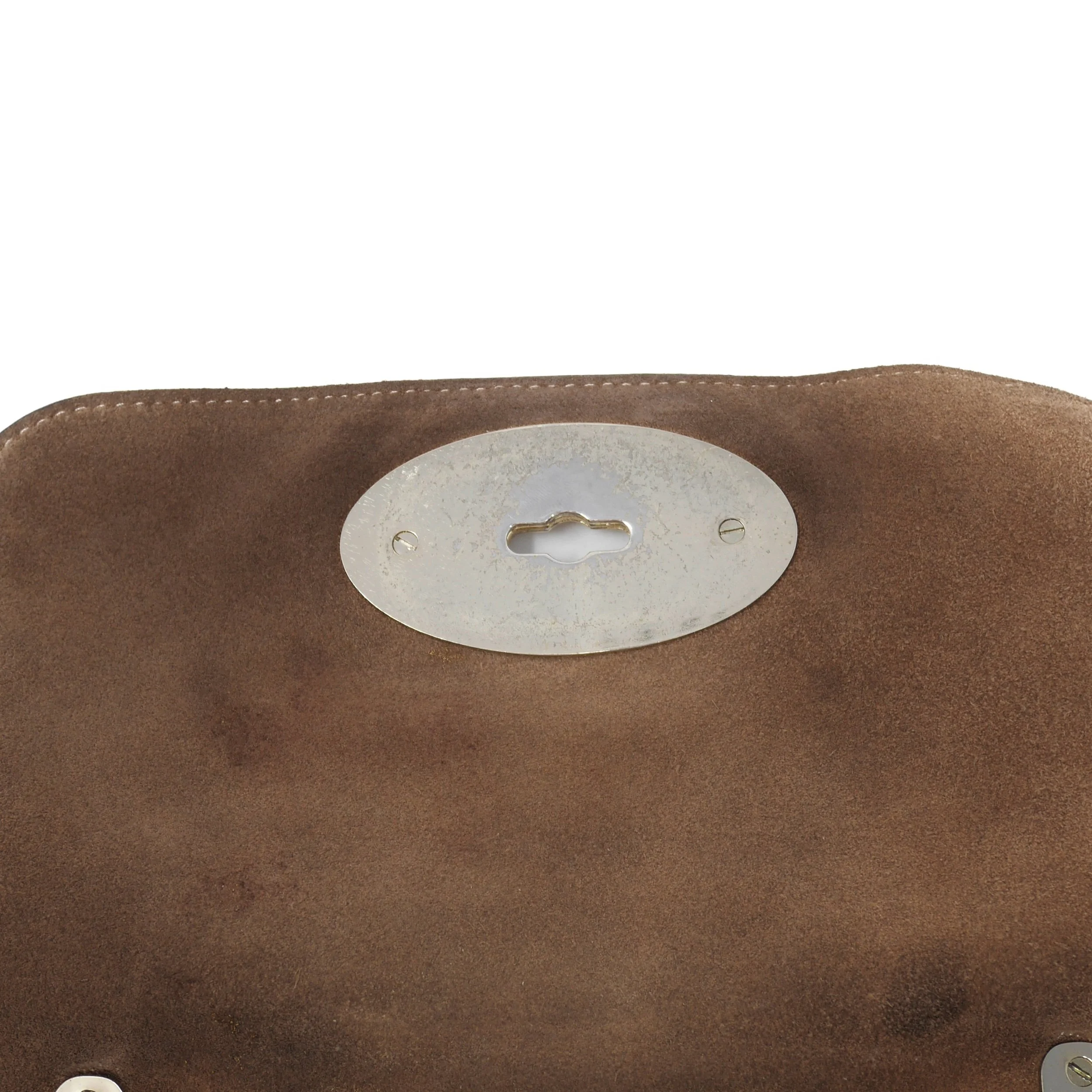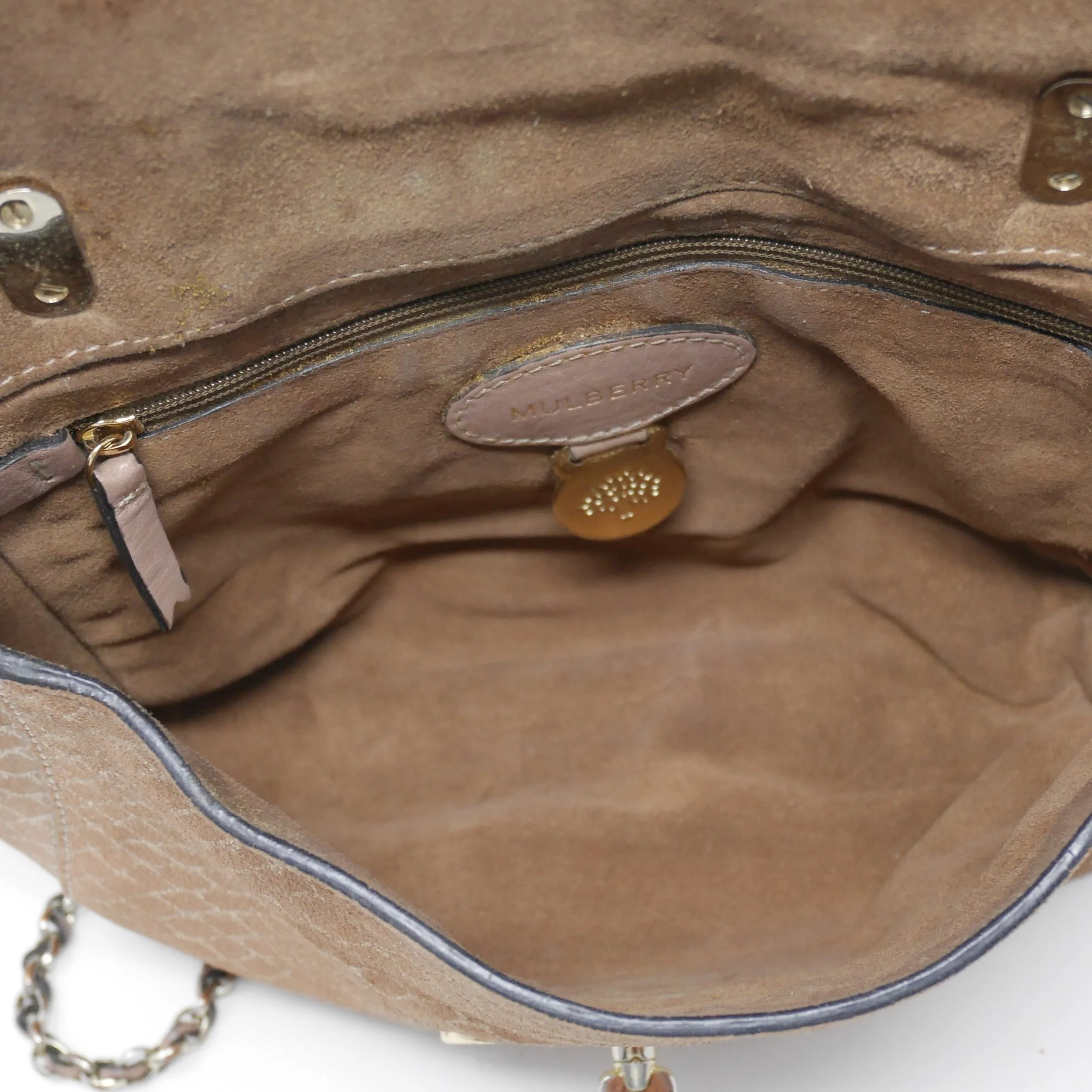 Interior: Soft suede lining with zip pocket and Mulberry leather label with metal tree disc