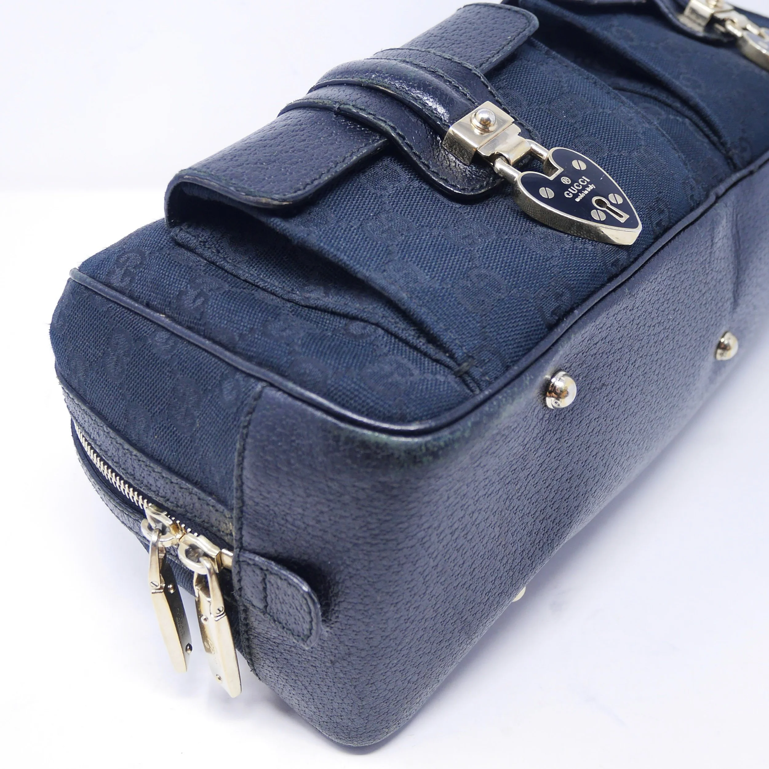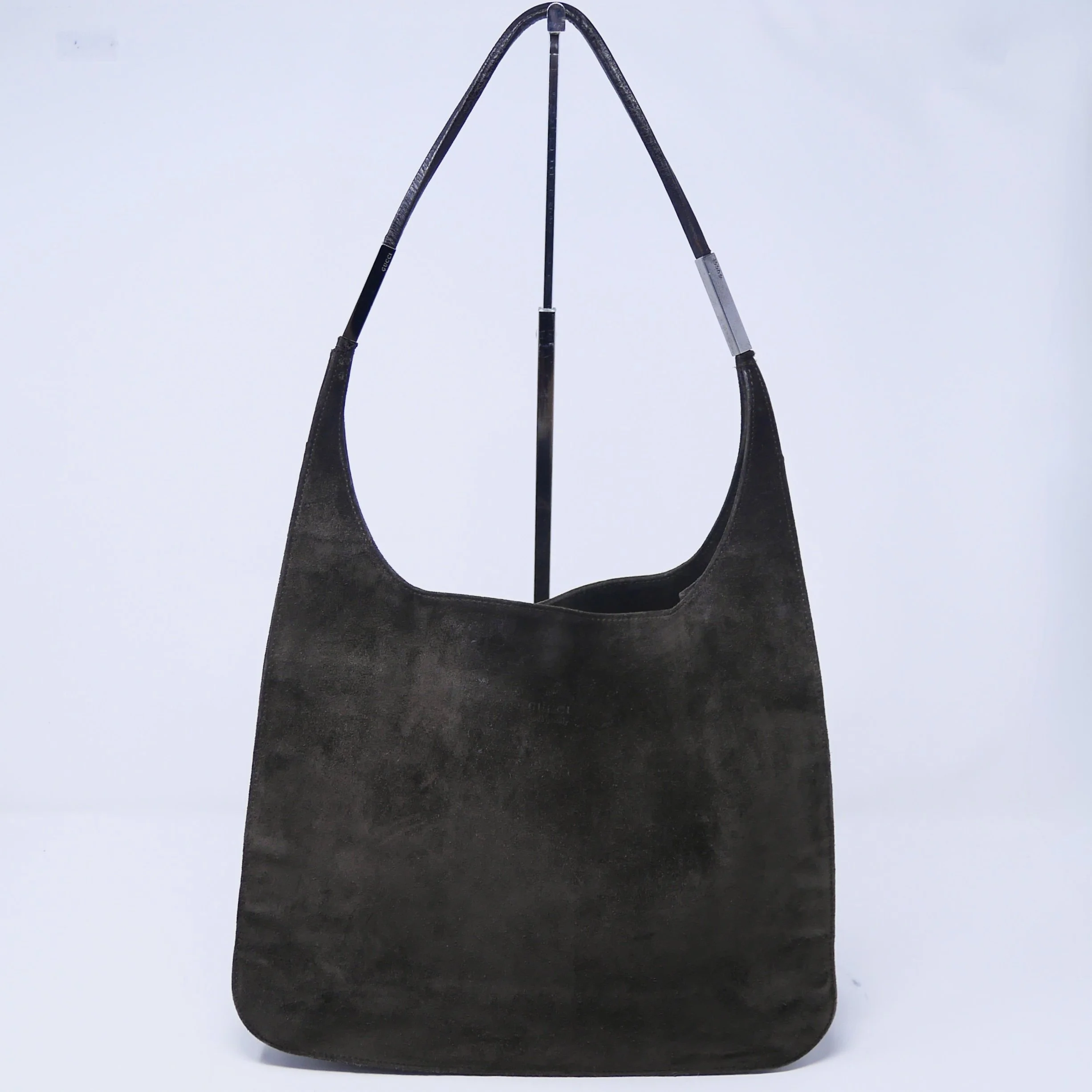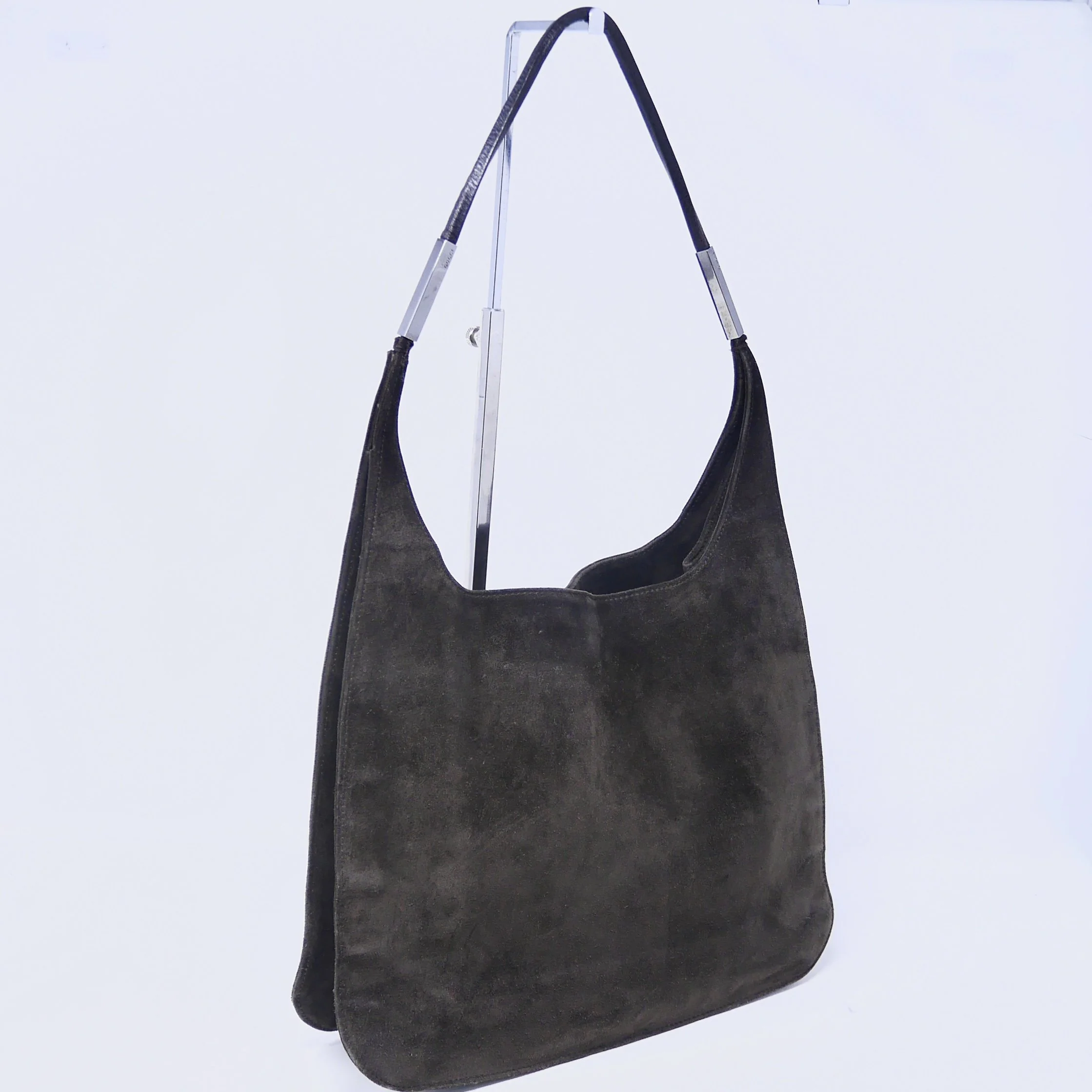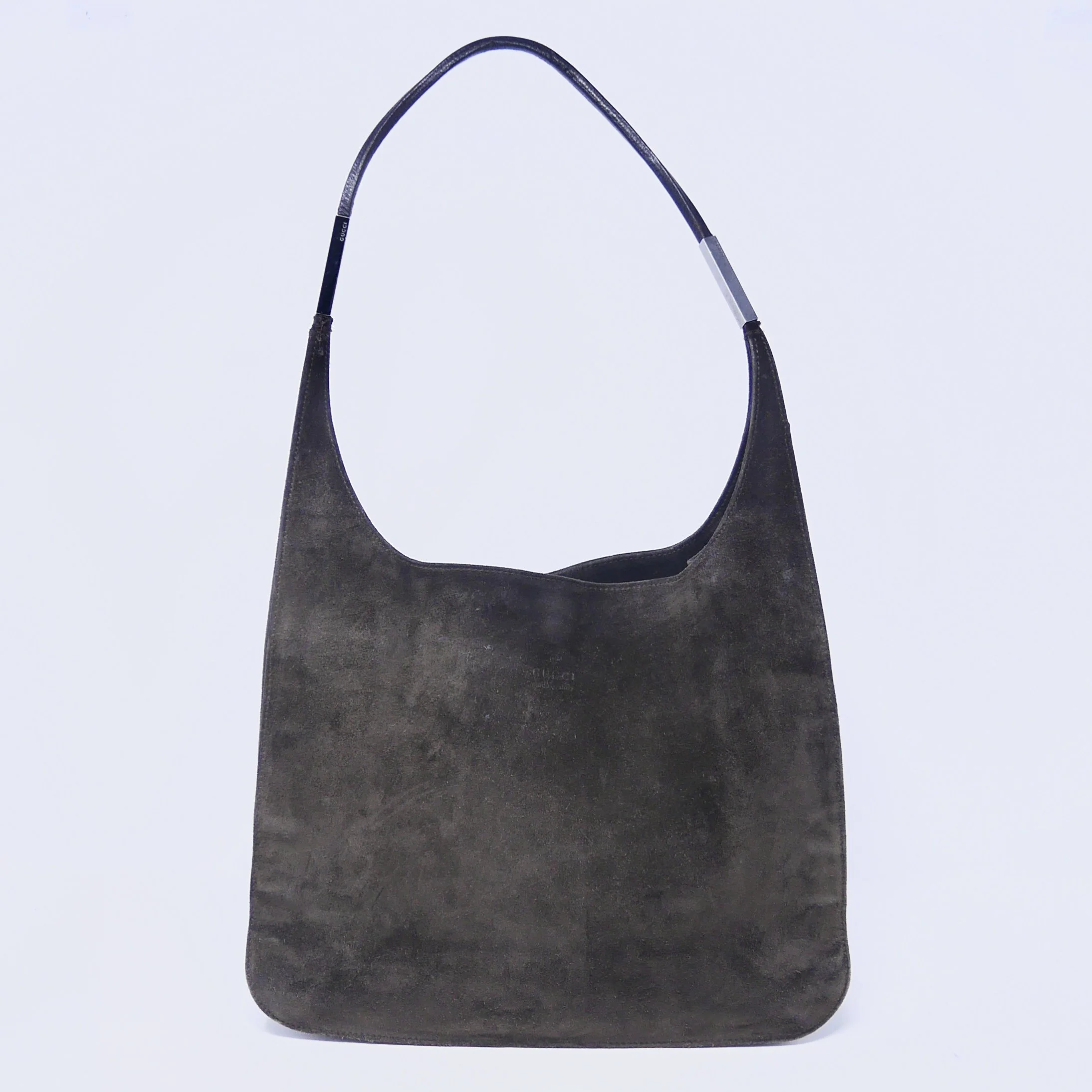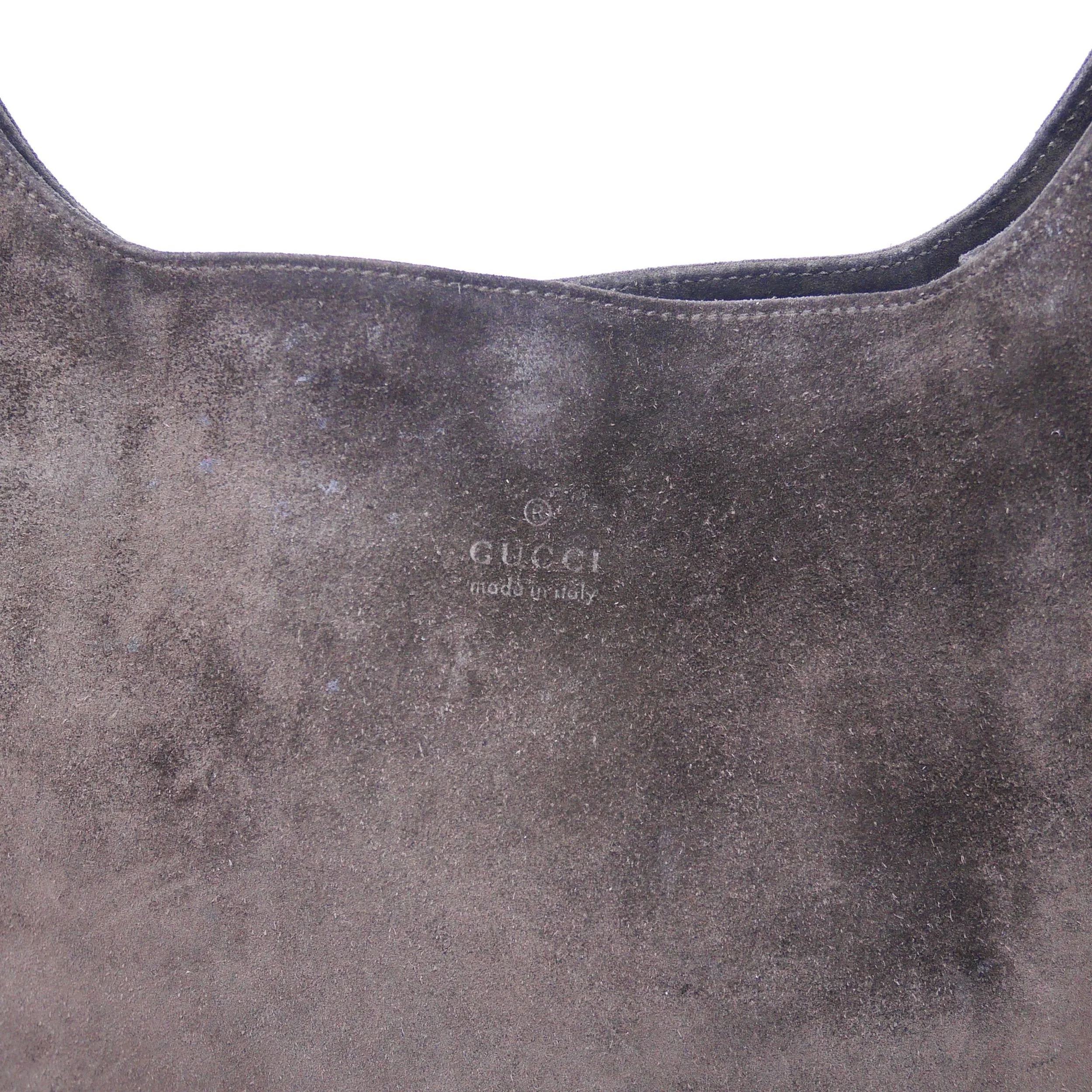 Good — overall wear to suede, slight darkening to corners and edges, and some tarnishing to hardware. Interior shows gentle use but remains clean and structurally sound.