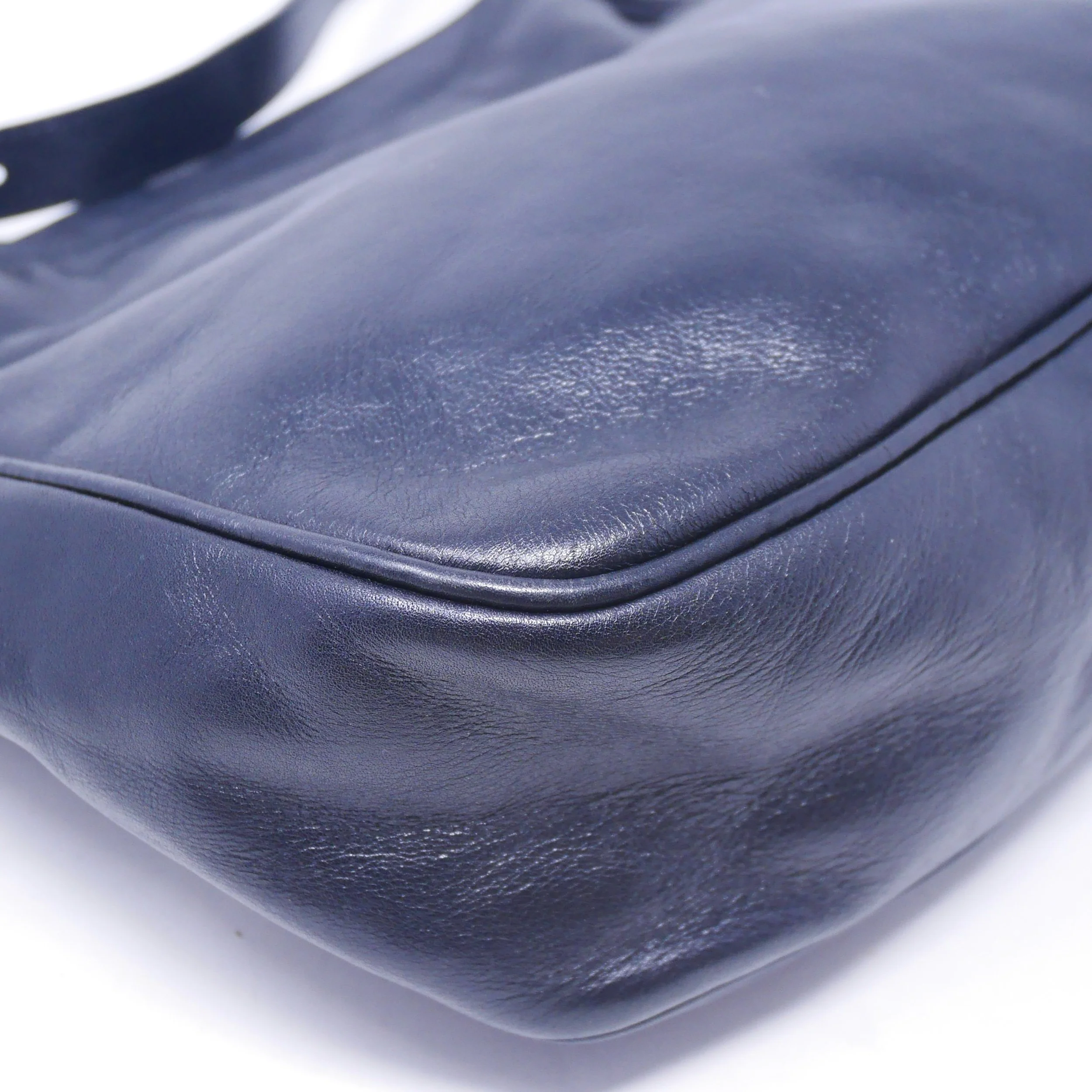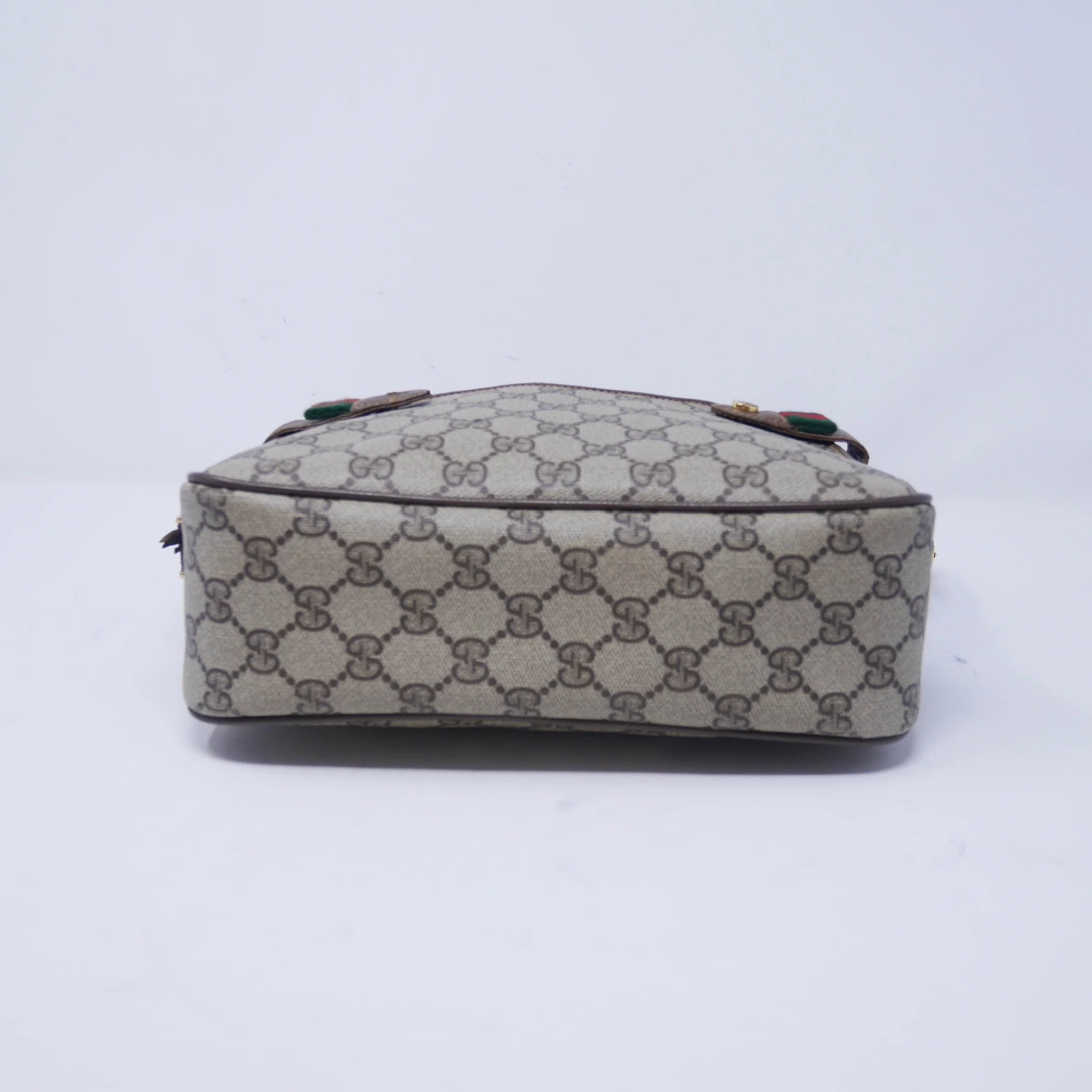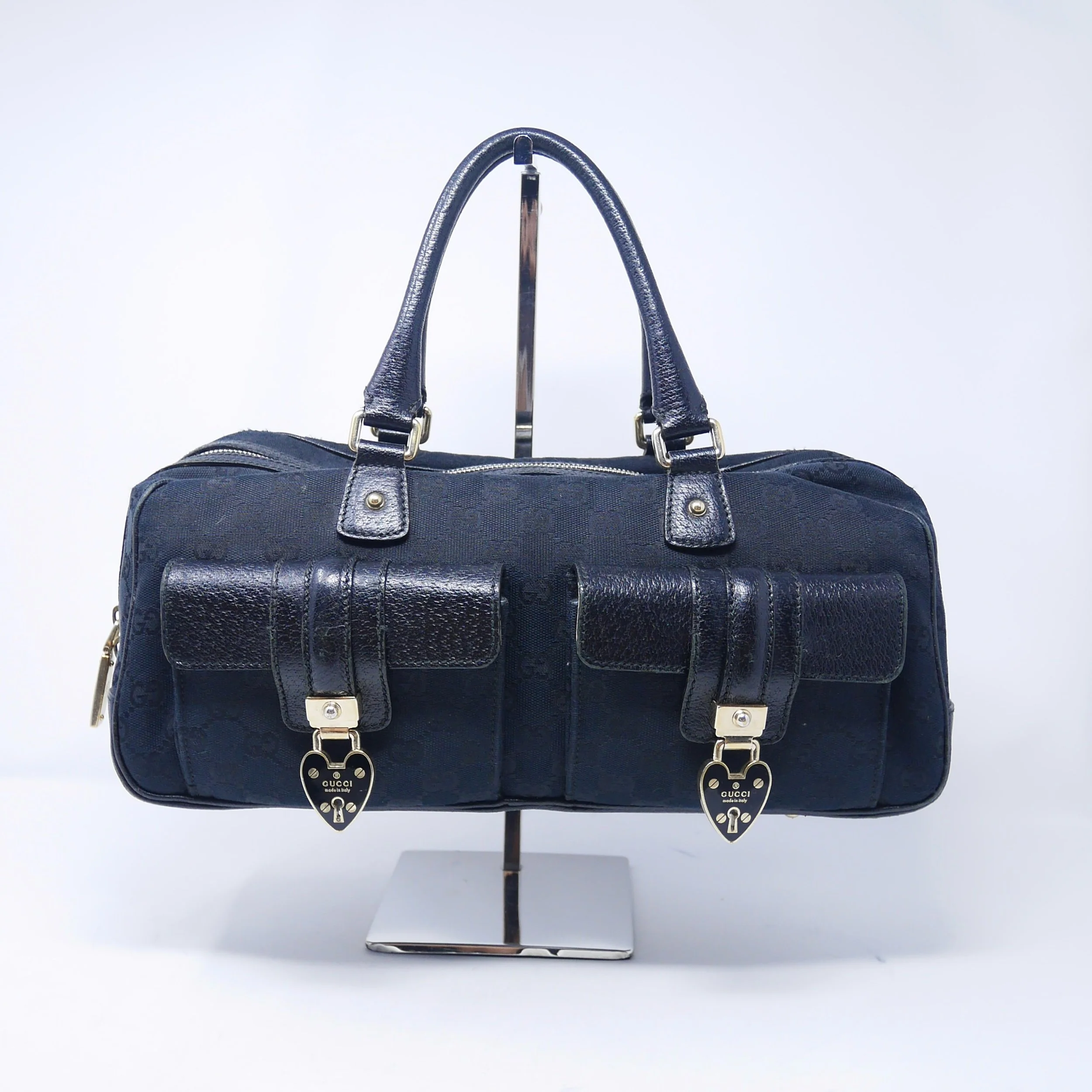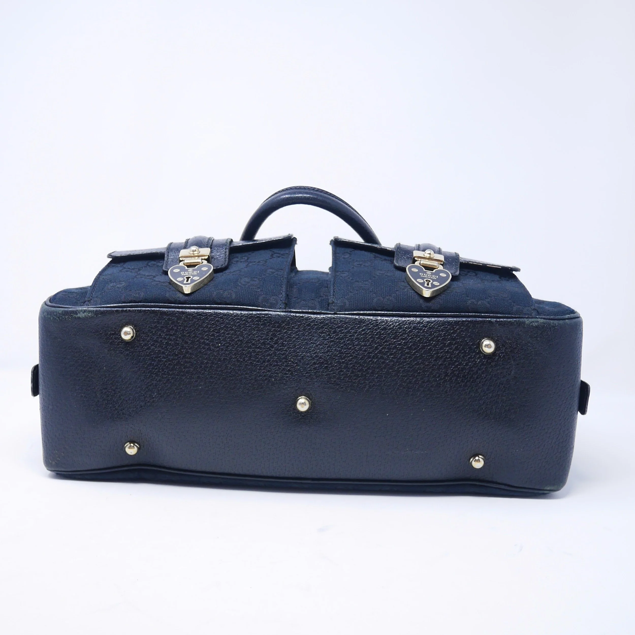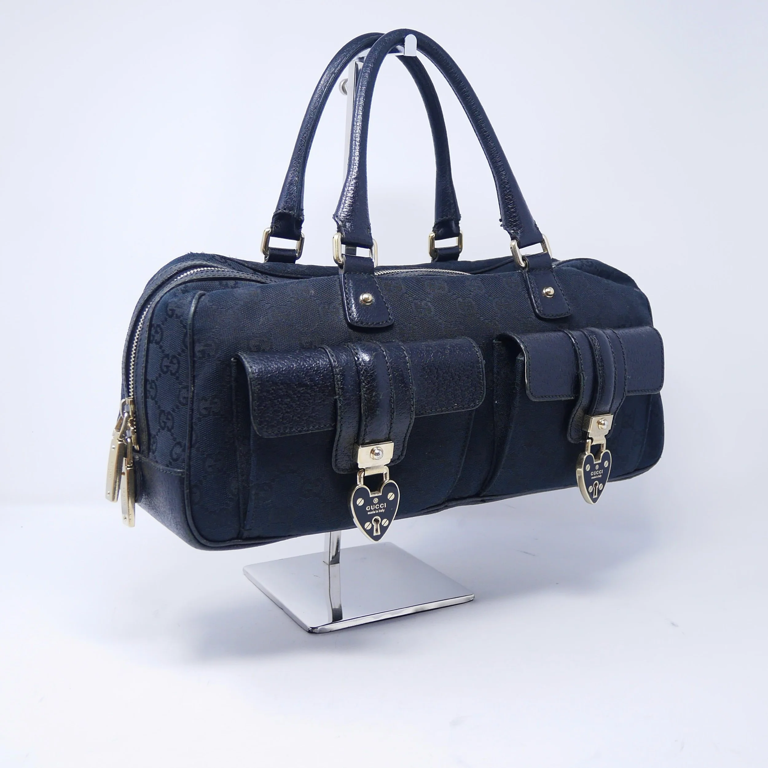 Good — overall wear to suede, slight darkening to corners and edges, and some tarnishing to hardware. Interior shows gentle use but remains clean and structurally sound.