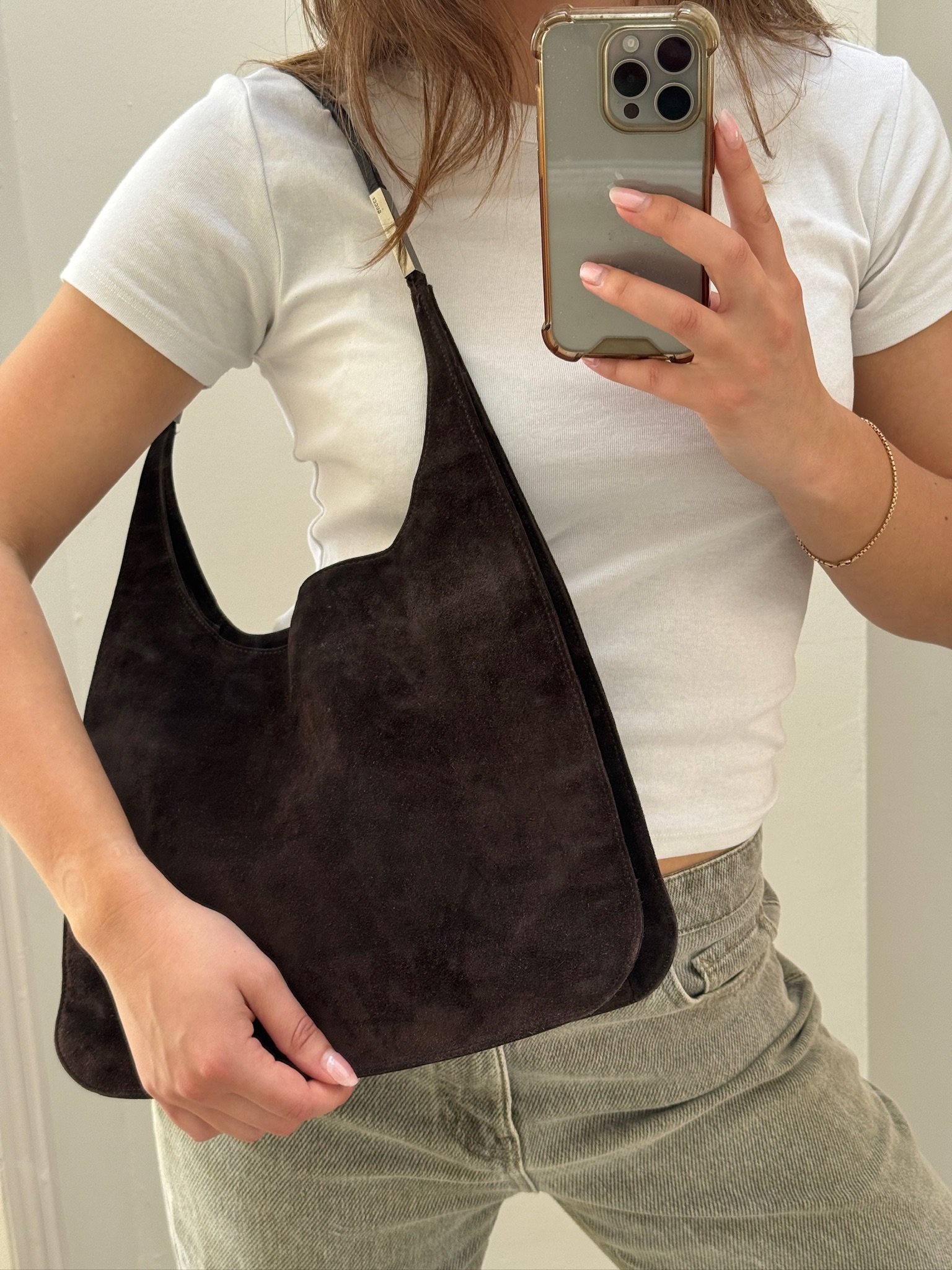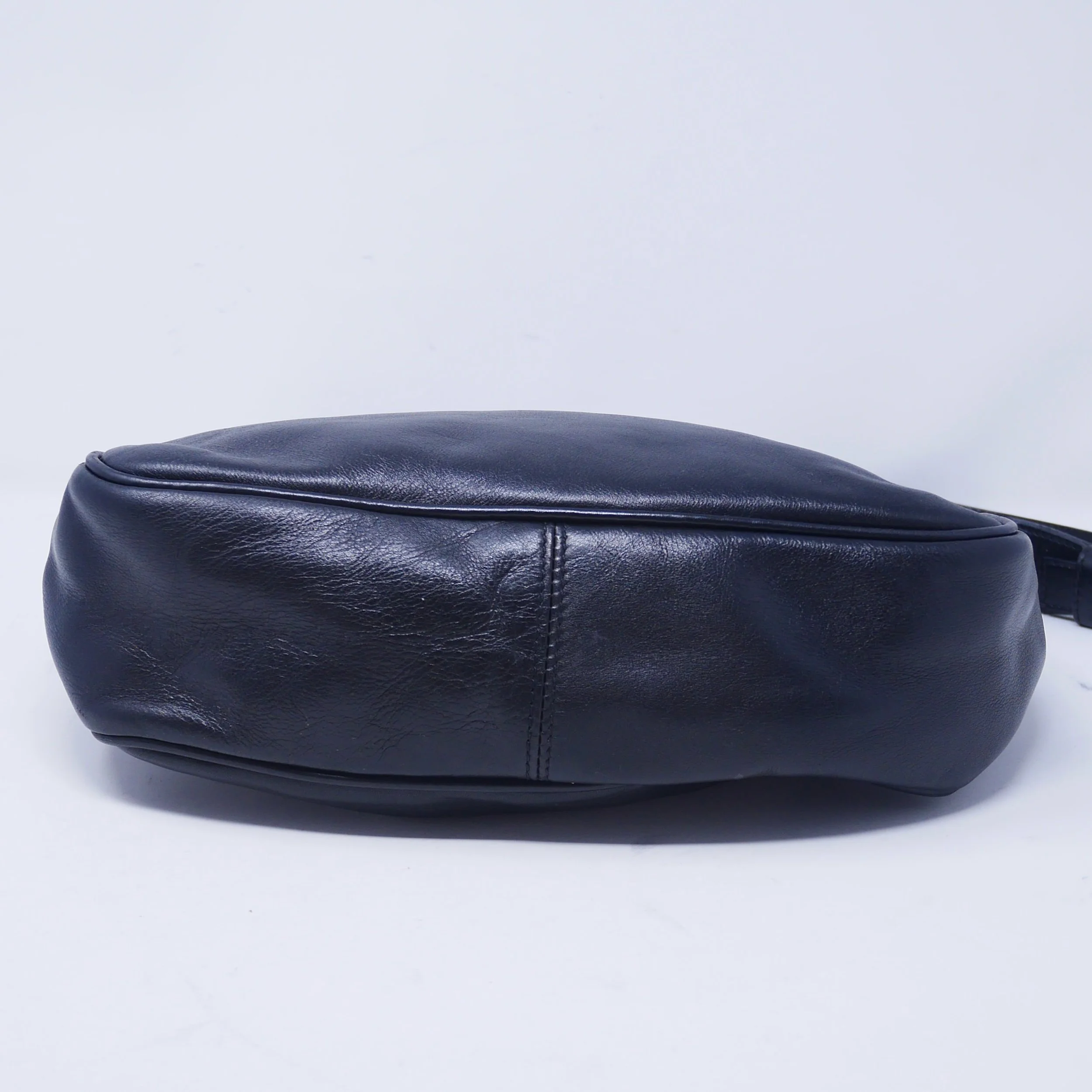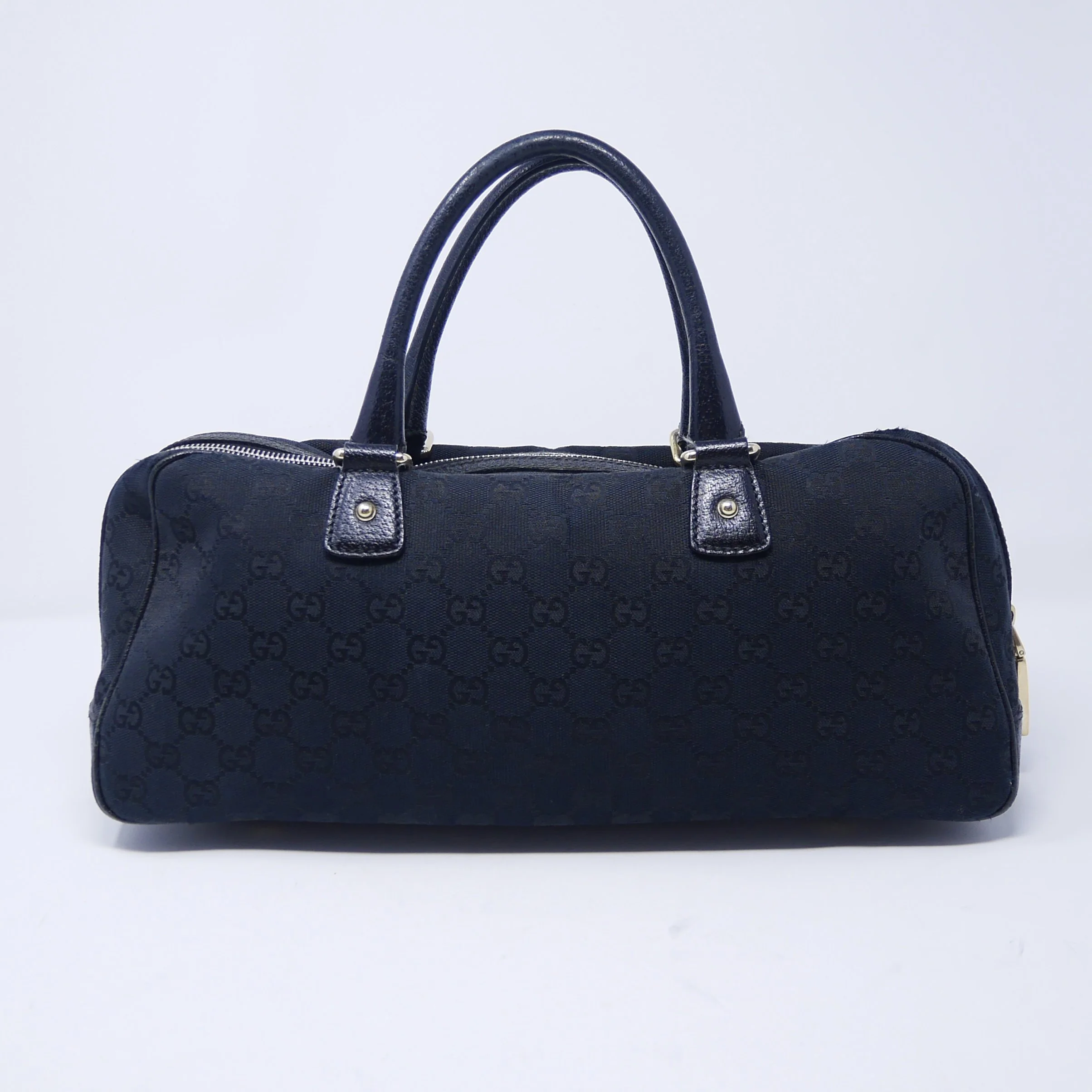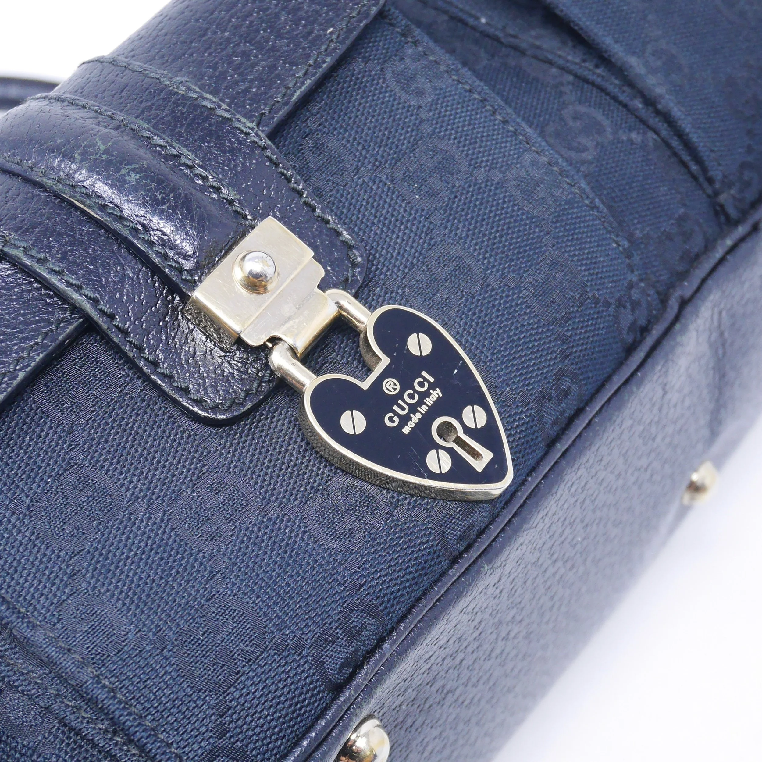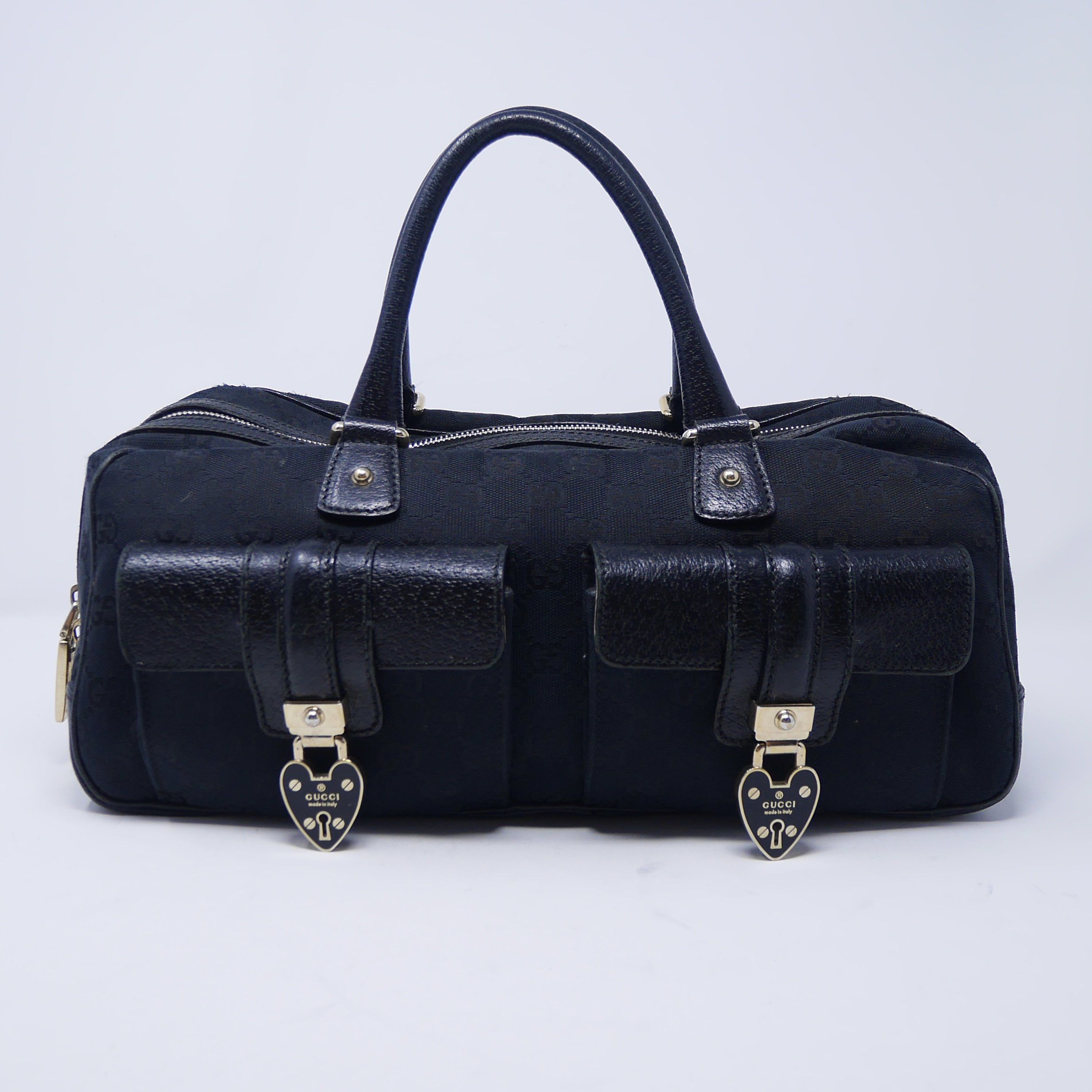 Good — overall wear to suede, slight darkening to corners and edges, and some tarnishing to hardware. Interior shows gentle use but remains clean and structurally sound.