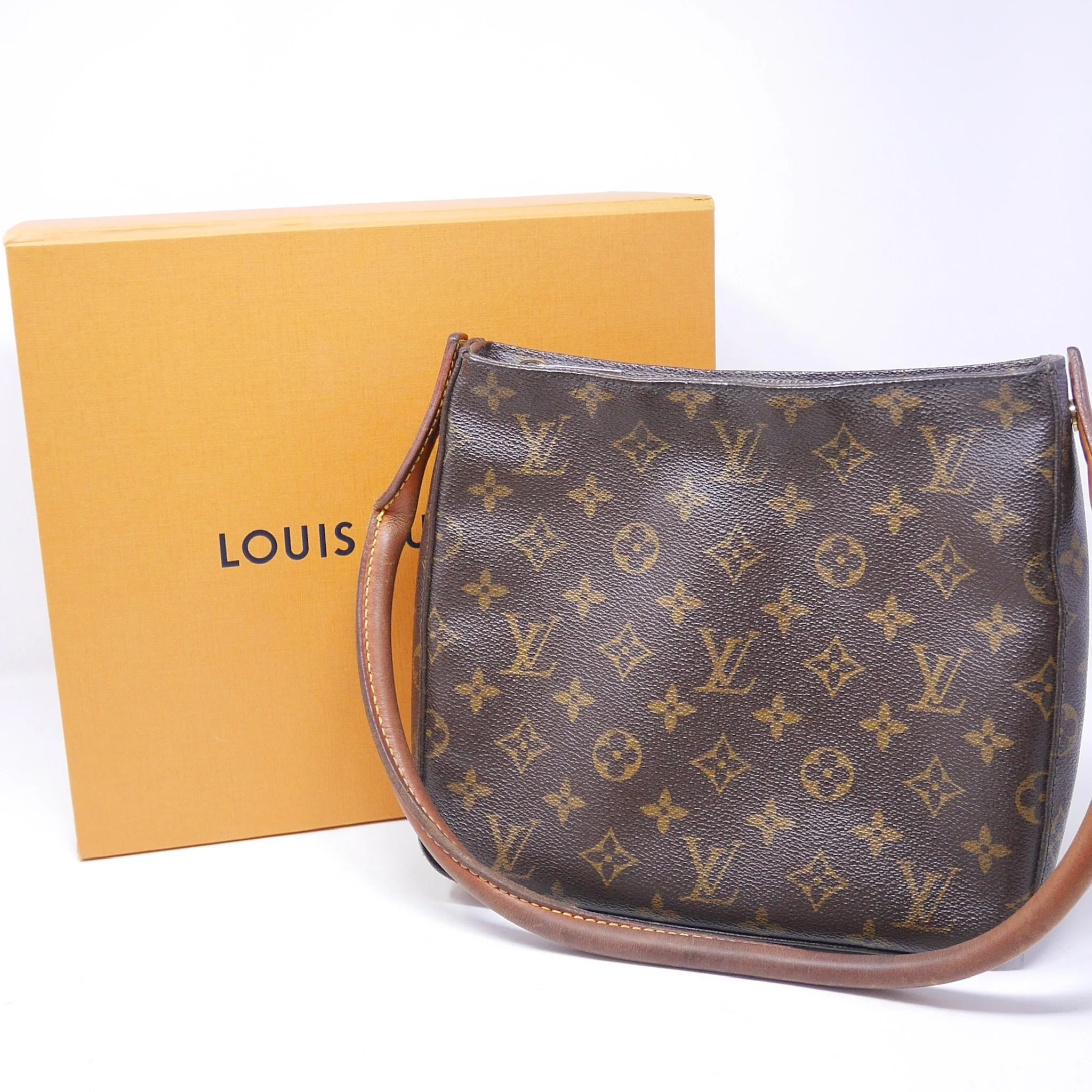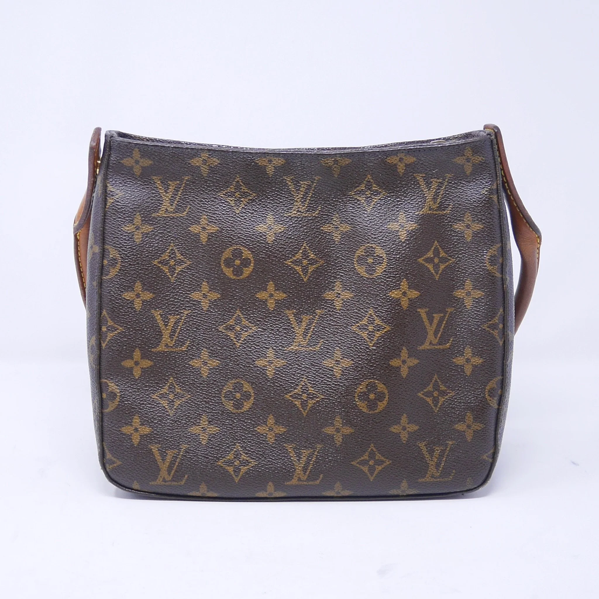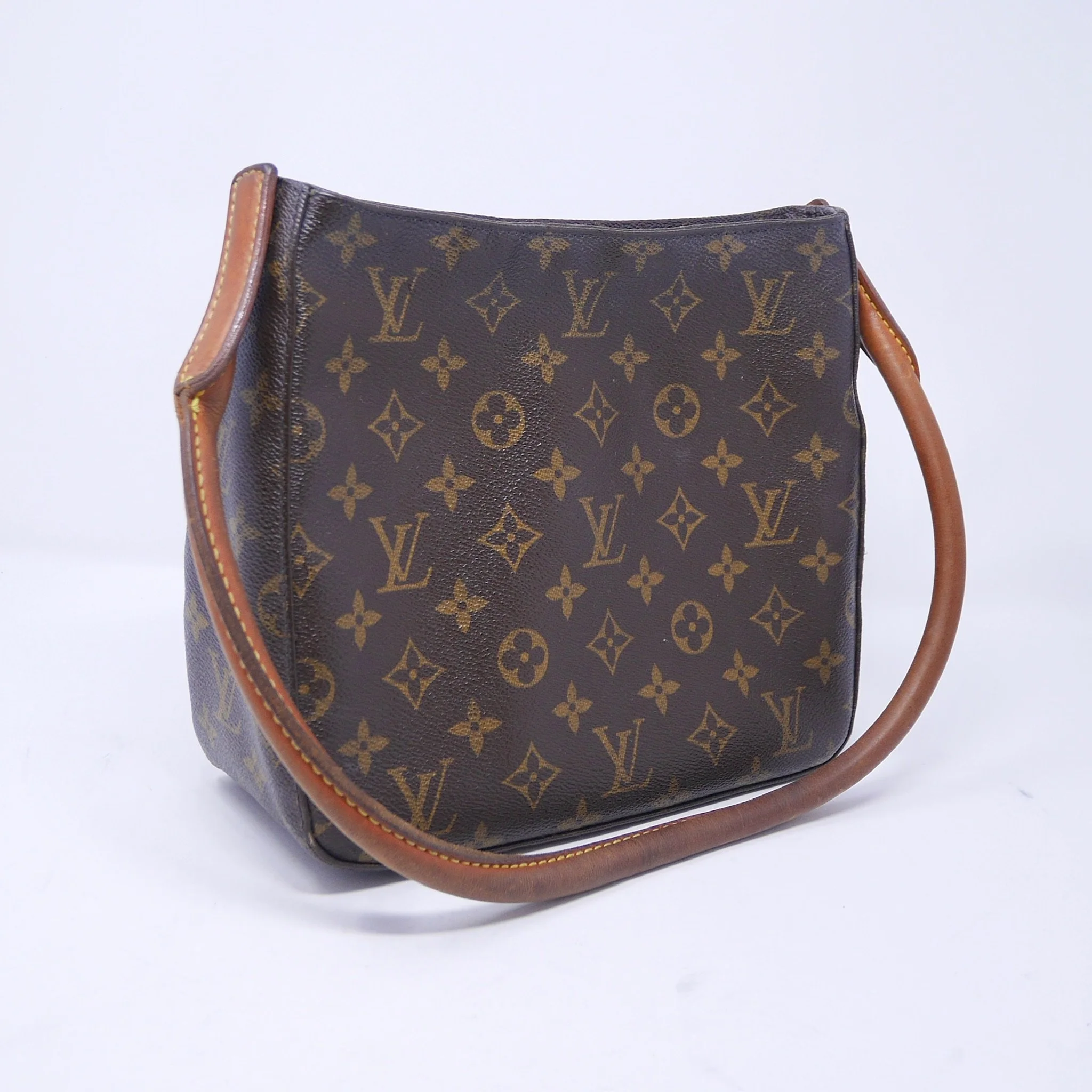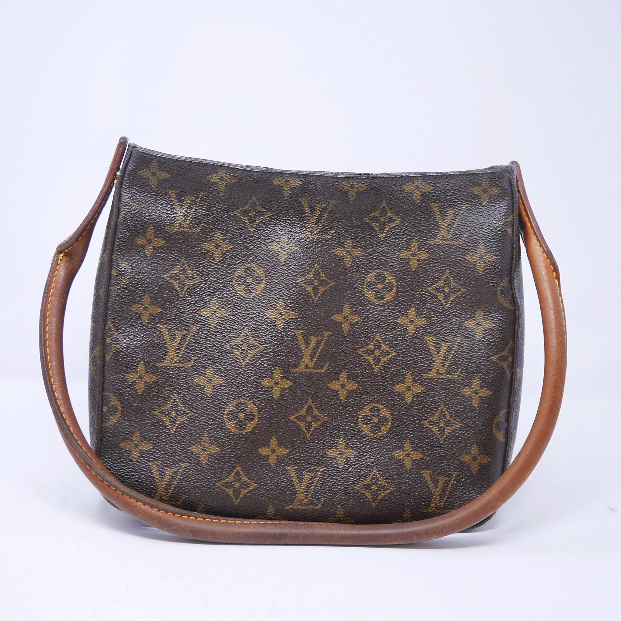 Classic Louis Vuitton Looping PM crafted in signature Monogram canvas with natural vachetta leather handle. A structured everyday piece with a curved silhouette and comfortable shoulder carry.