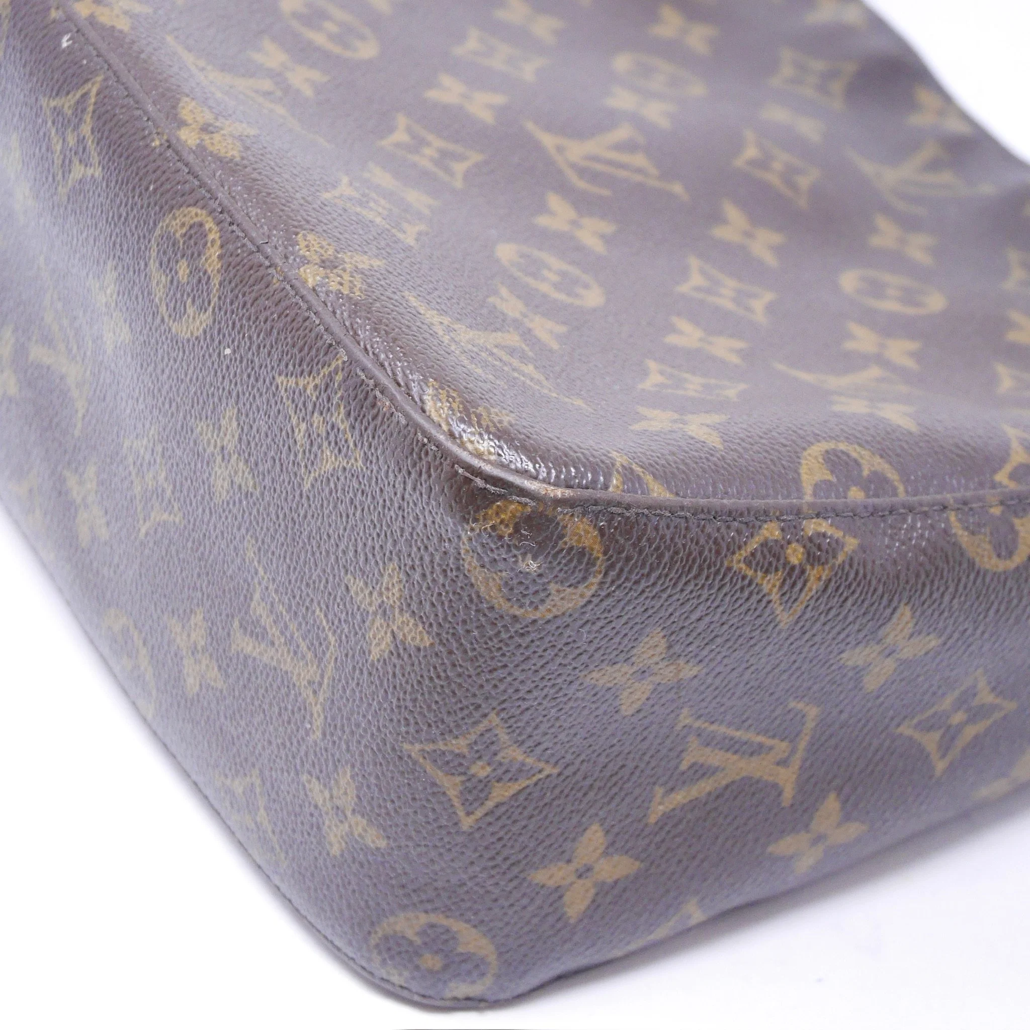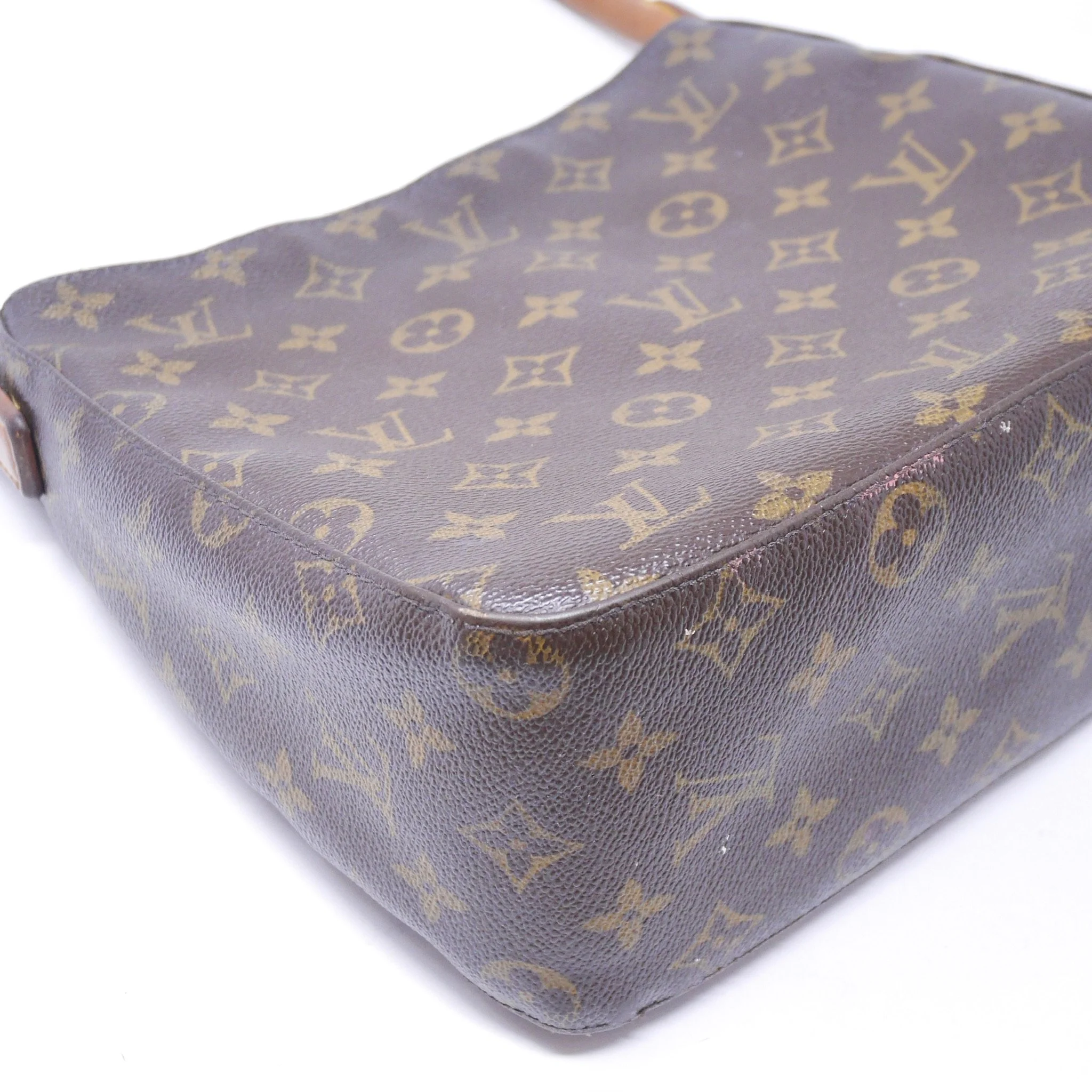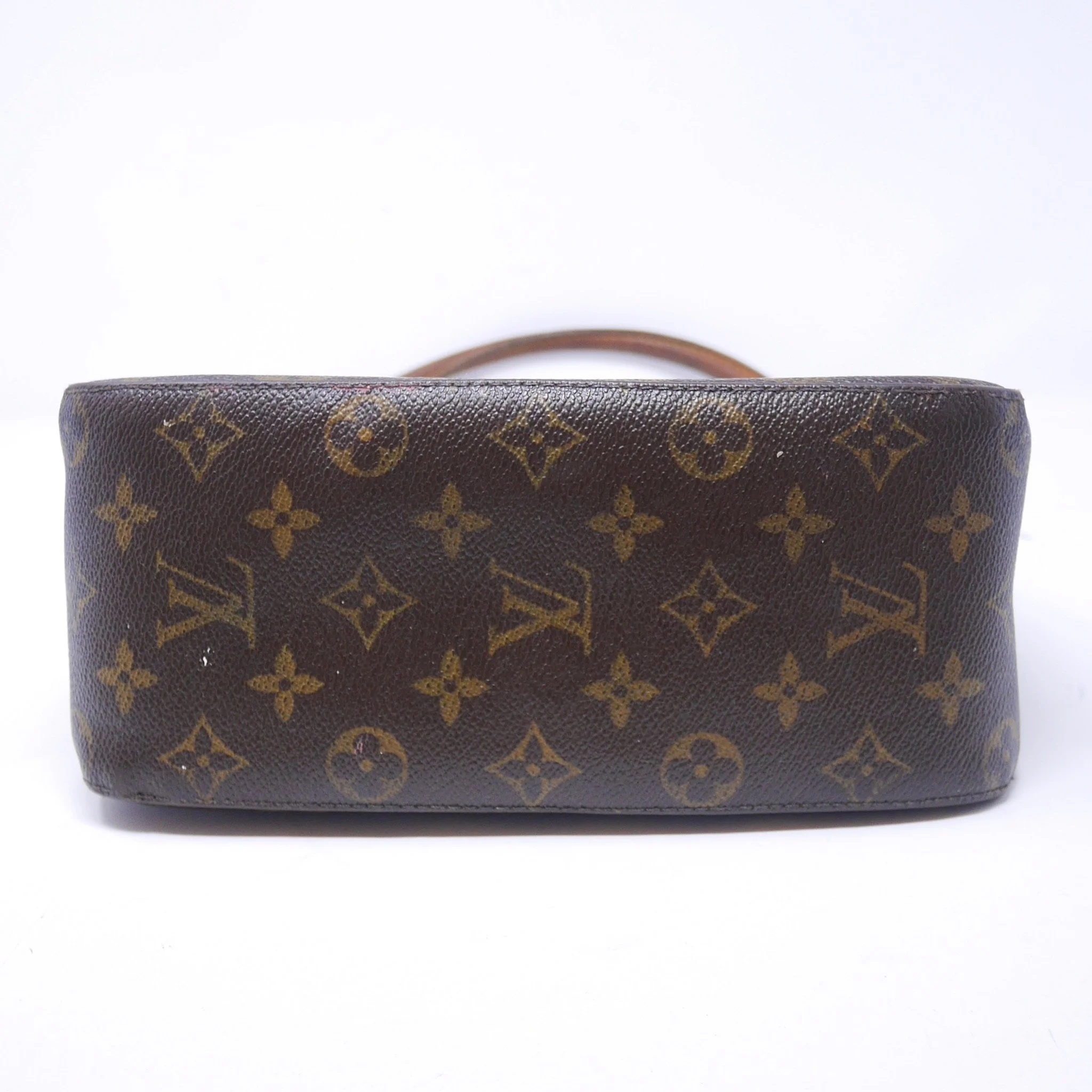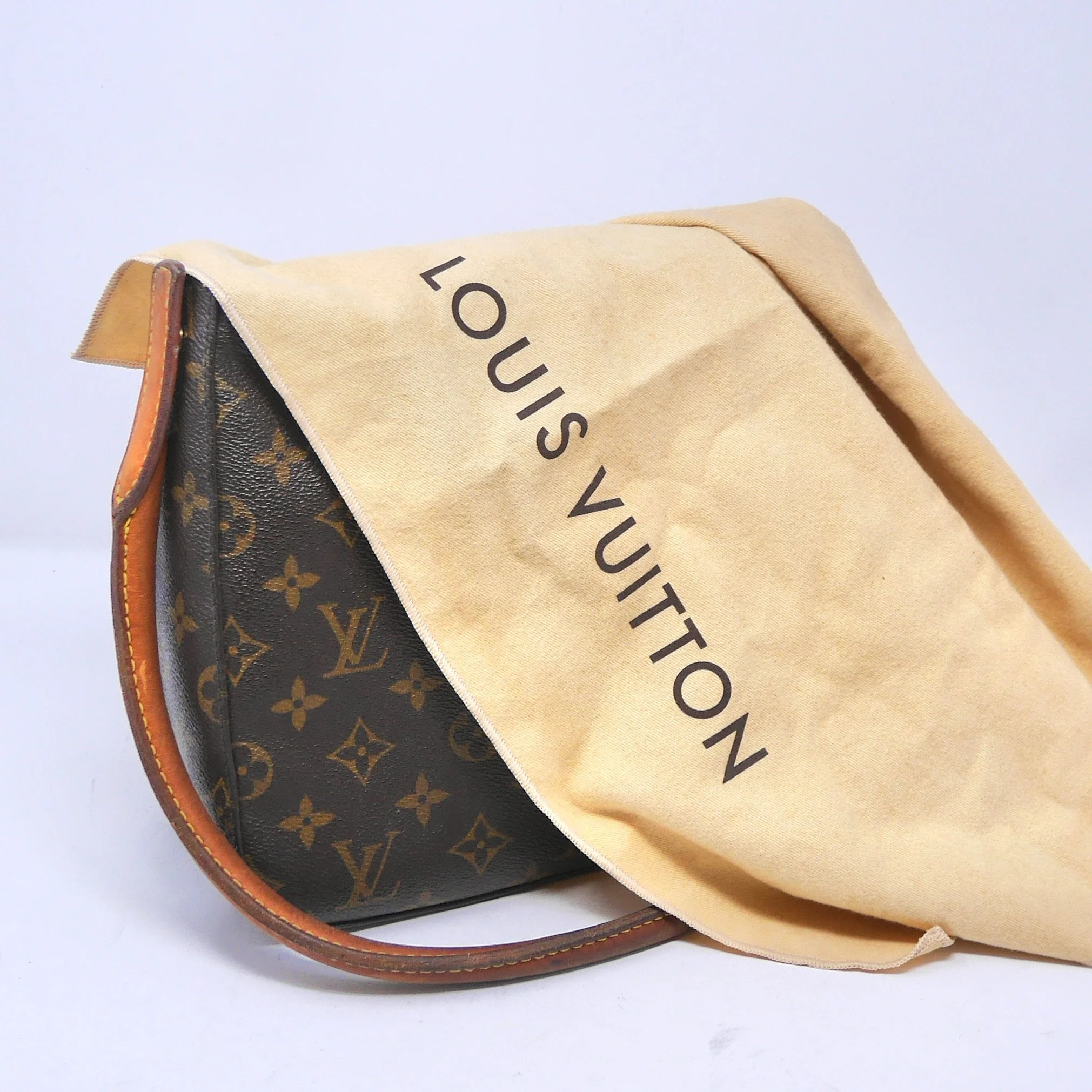Classic Louis Vuitton Looping PM crafted in signature Monogram canvas with natural vachetta leather handle. A structured everyday piece with a curved silhouette and comfortable shoulder carry.