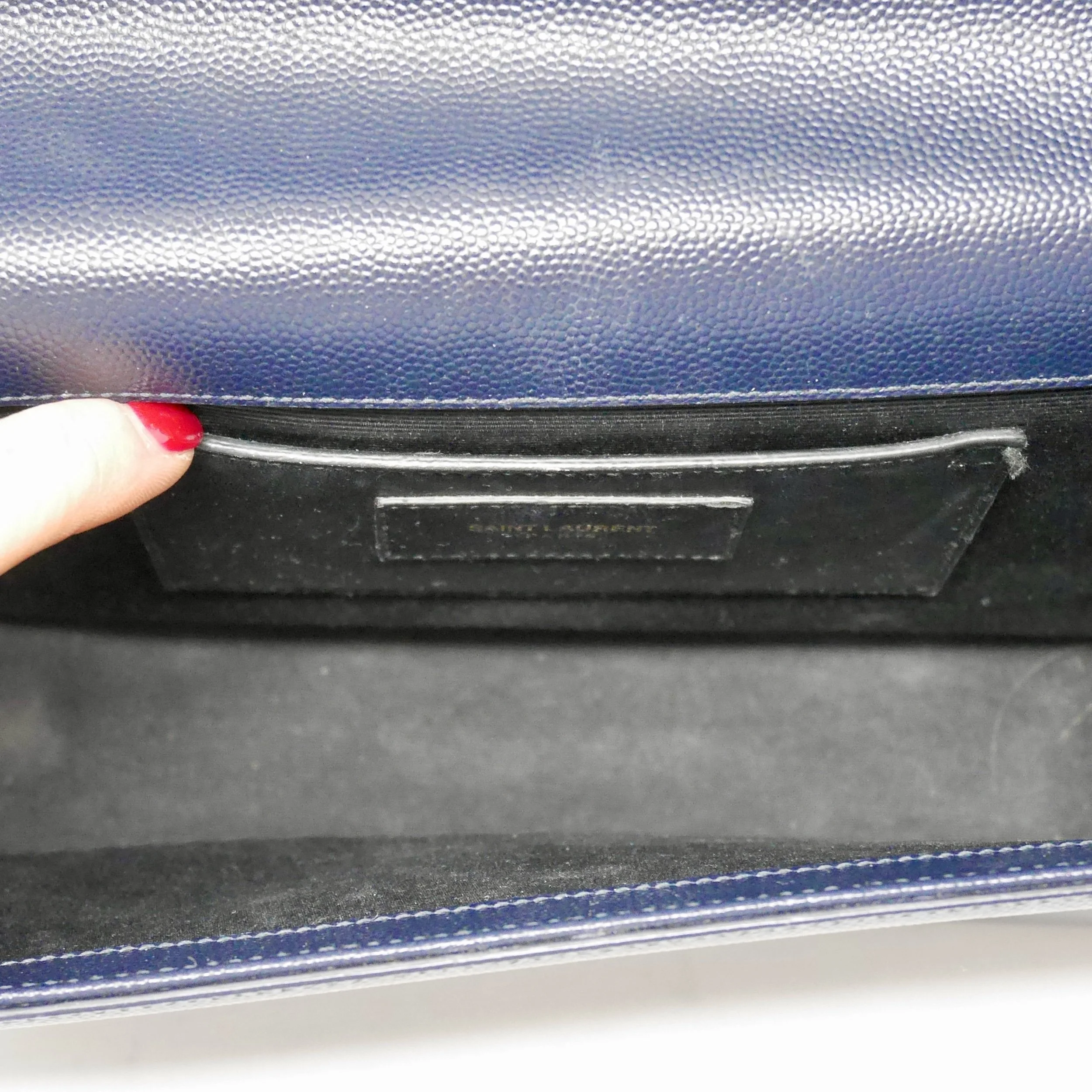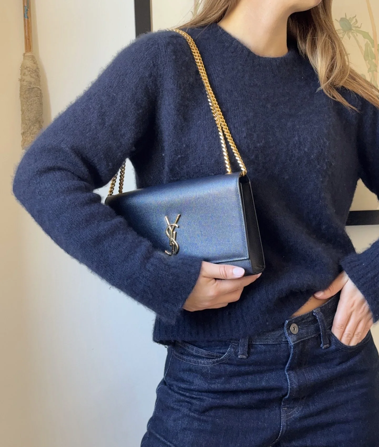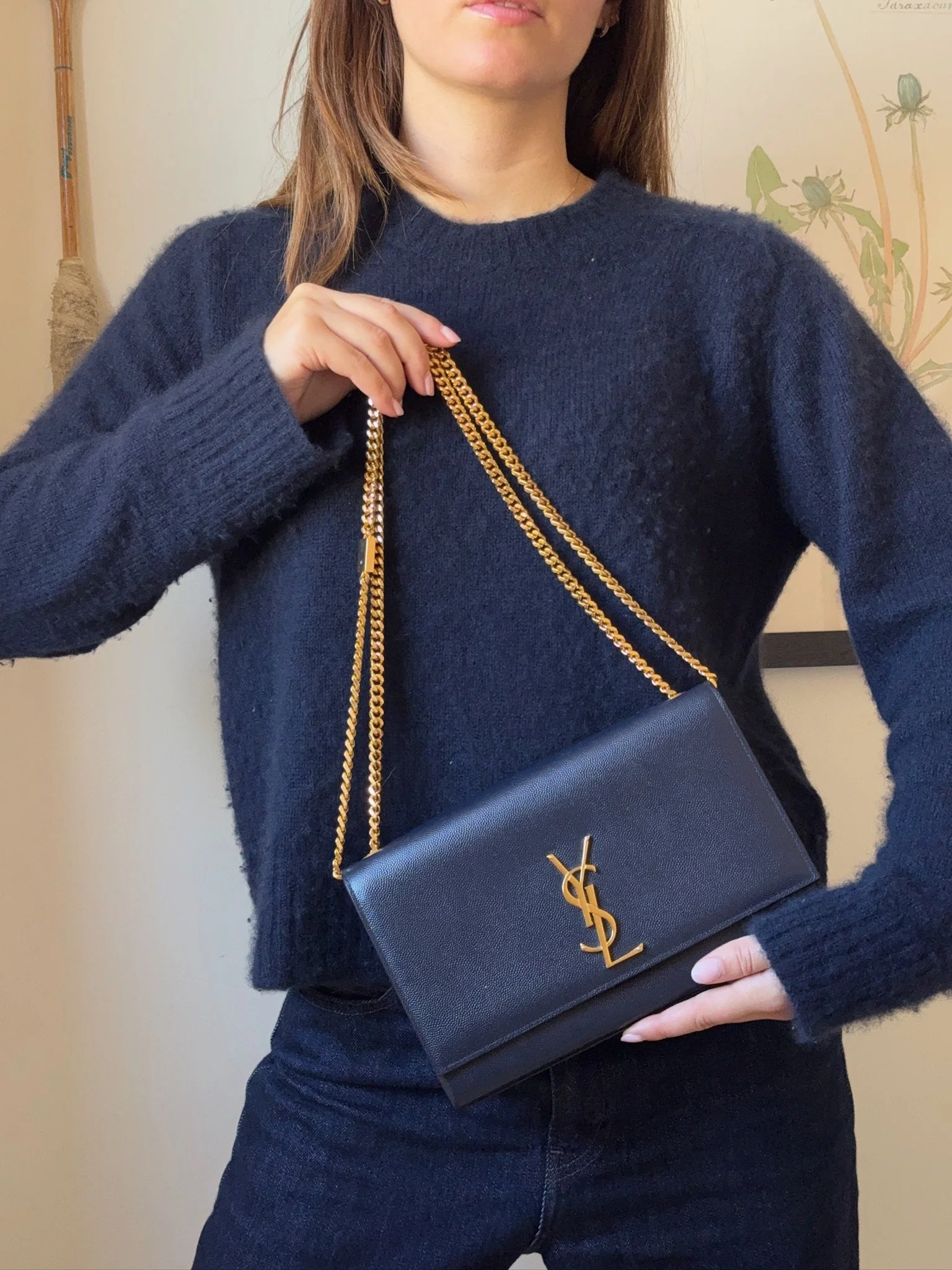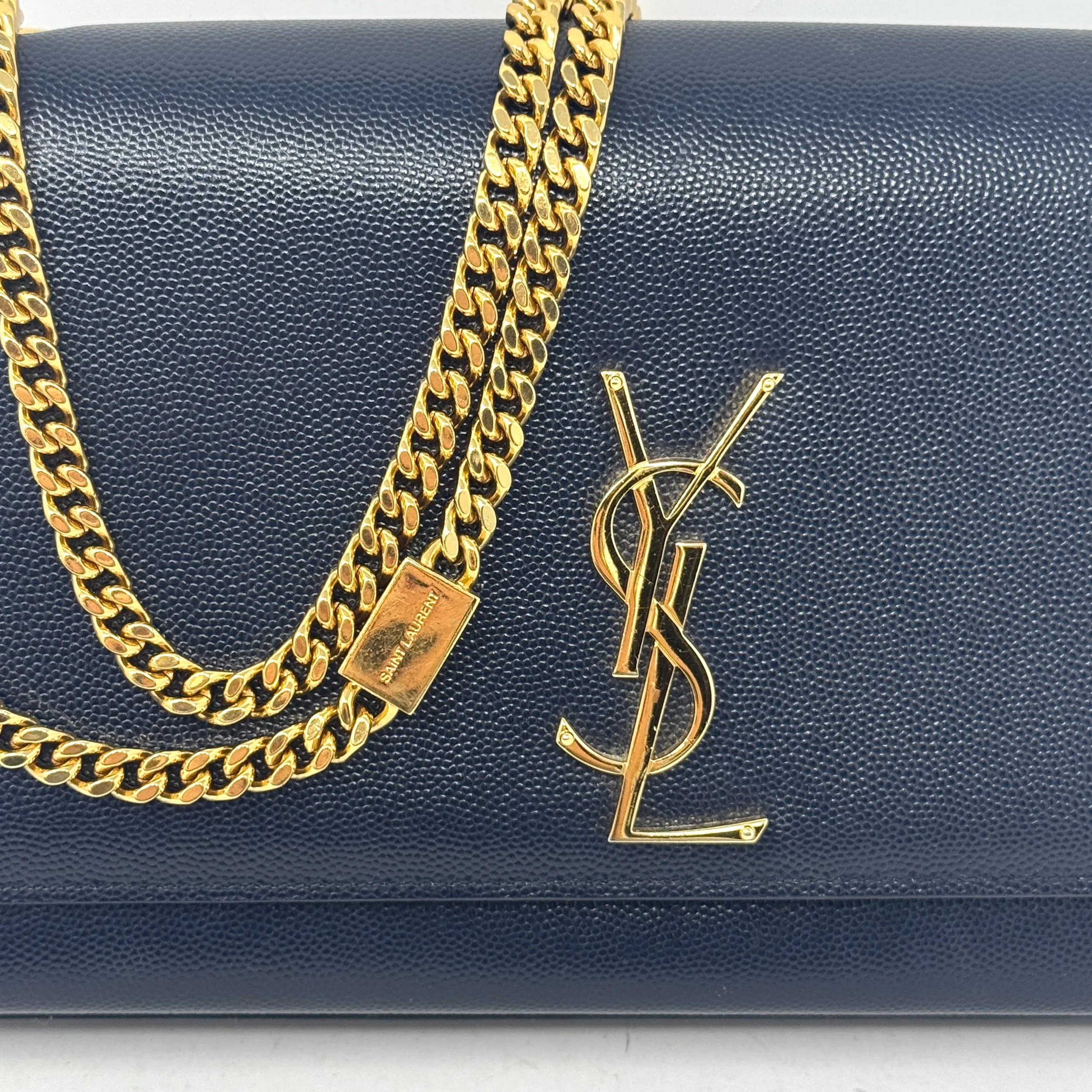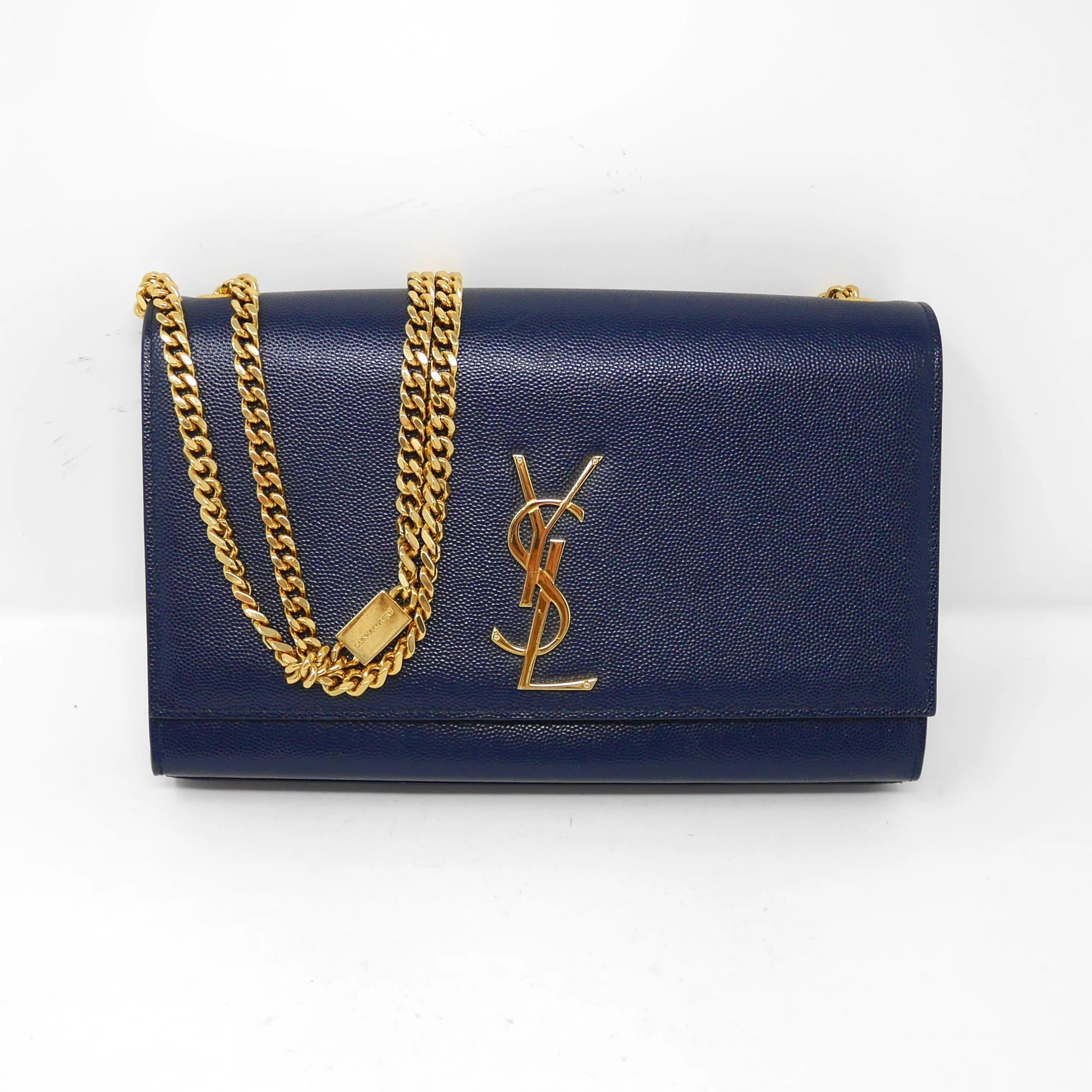 A timeless Saint Laurent Kate Medium Chain Bag crafted in navy blue Grain de Poudre textured leather. Accented with gold-tone hardware and the iconic YSL monogram logo plaque. Features a magnetic flap closure and a sliding chain strap for shoulder or crossbody wear.